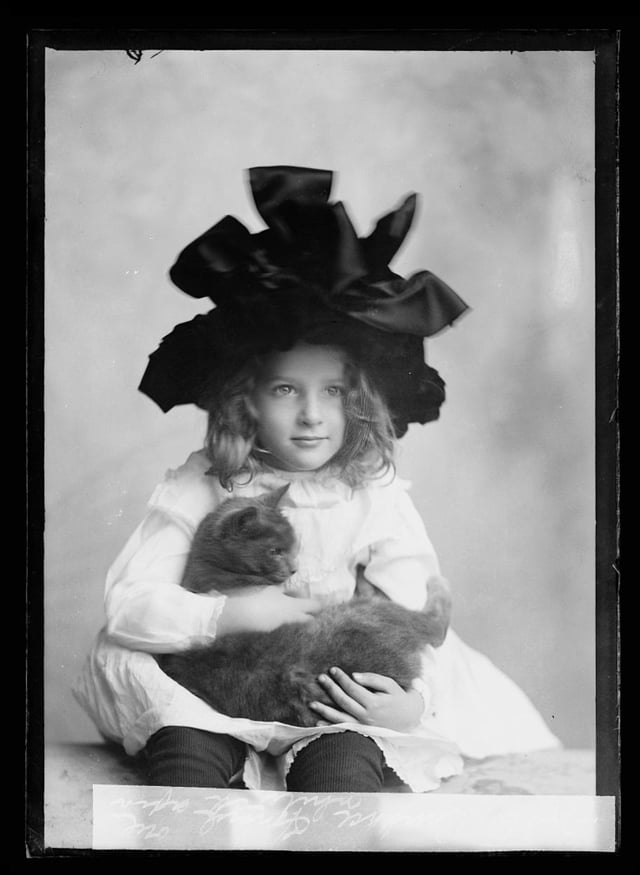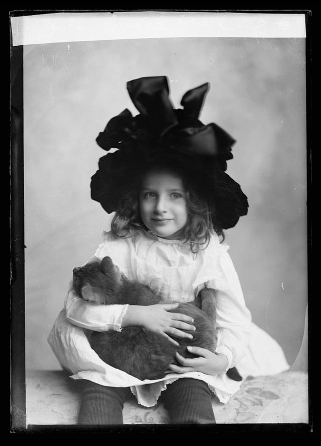 Crisp shot of a girl posing with her cat, glass negative 1890s.