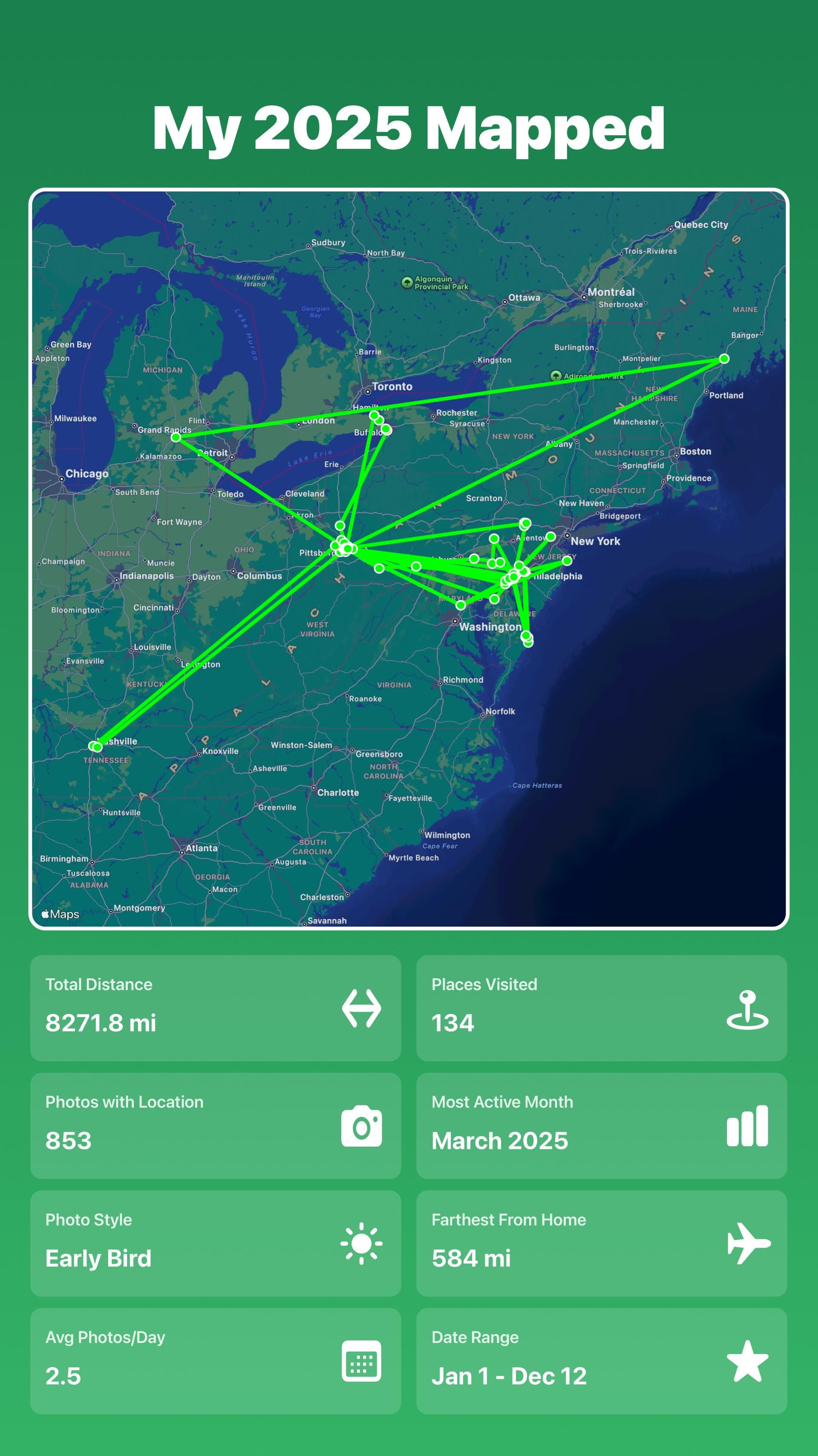Hi everyone, I made an app (Mapped 25 in the app store, link below) that takes the photos in your camera roll, and using the gps metadata, generates a map of where you went during the year. There's other features like showing 12 of your photos, one for each month, and generating constellations based on the map, and even a 15 second photo collage under the map in video format, but I think this is the coolest part to show off for r/dataisbeautiful.