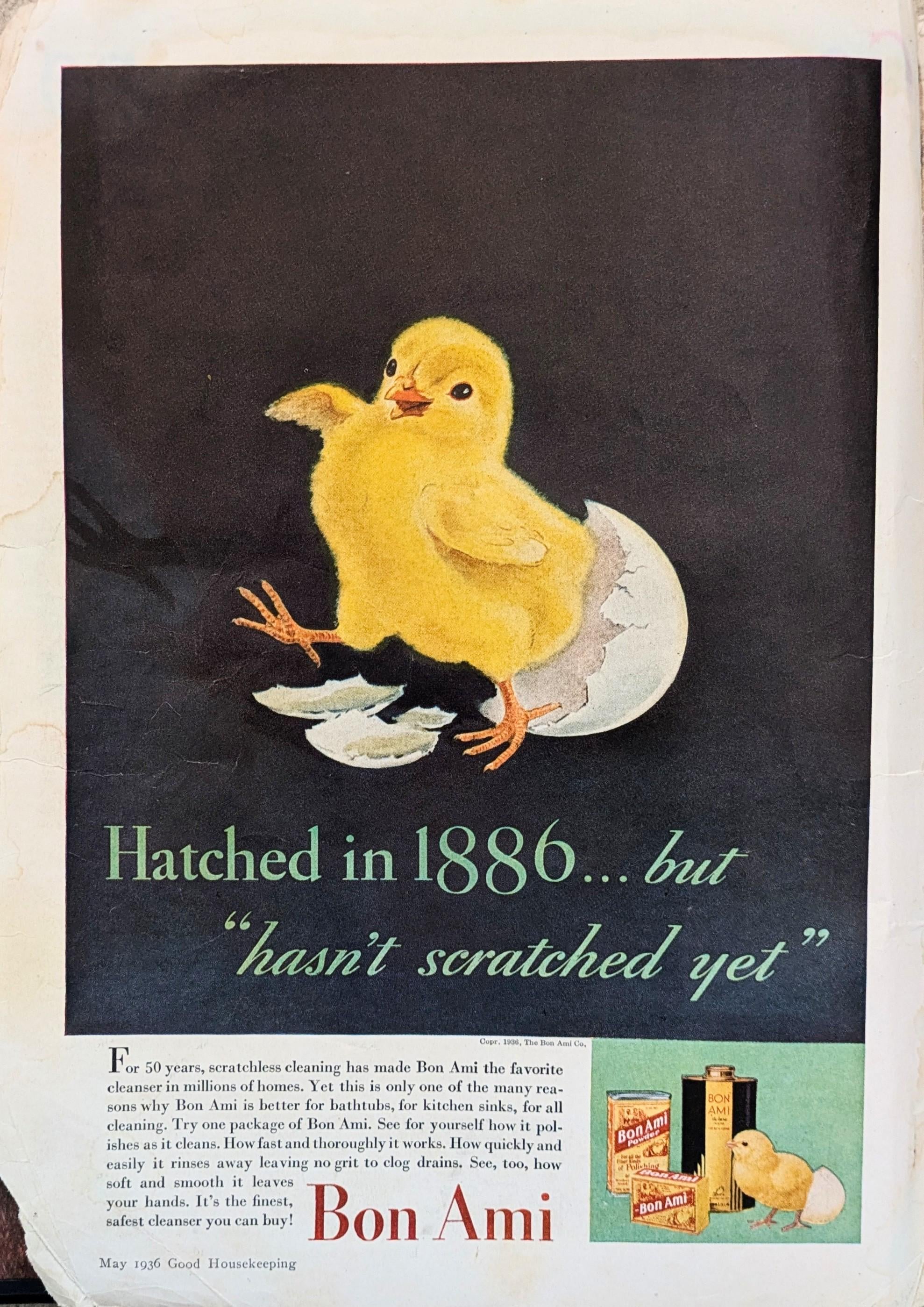 Bon Ami still makes cleanser powder to this day. The chick used in it's advertising came to be in the late 1800's, because "a just-hatched chick became the perfect symbol for gentle Bon Ami because baby chicks don't scratch for food like older chickens do." (www.bonami.com/our-story/)