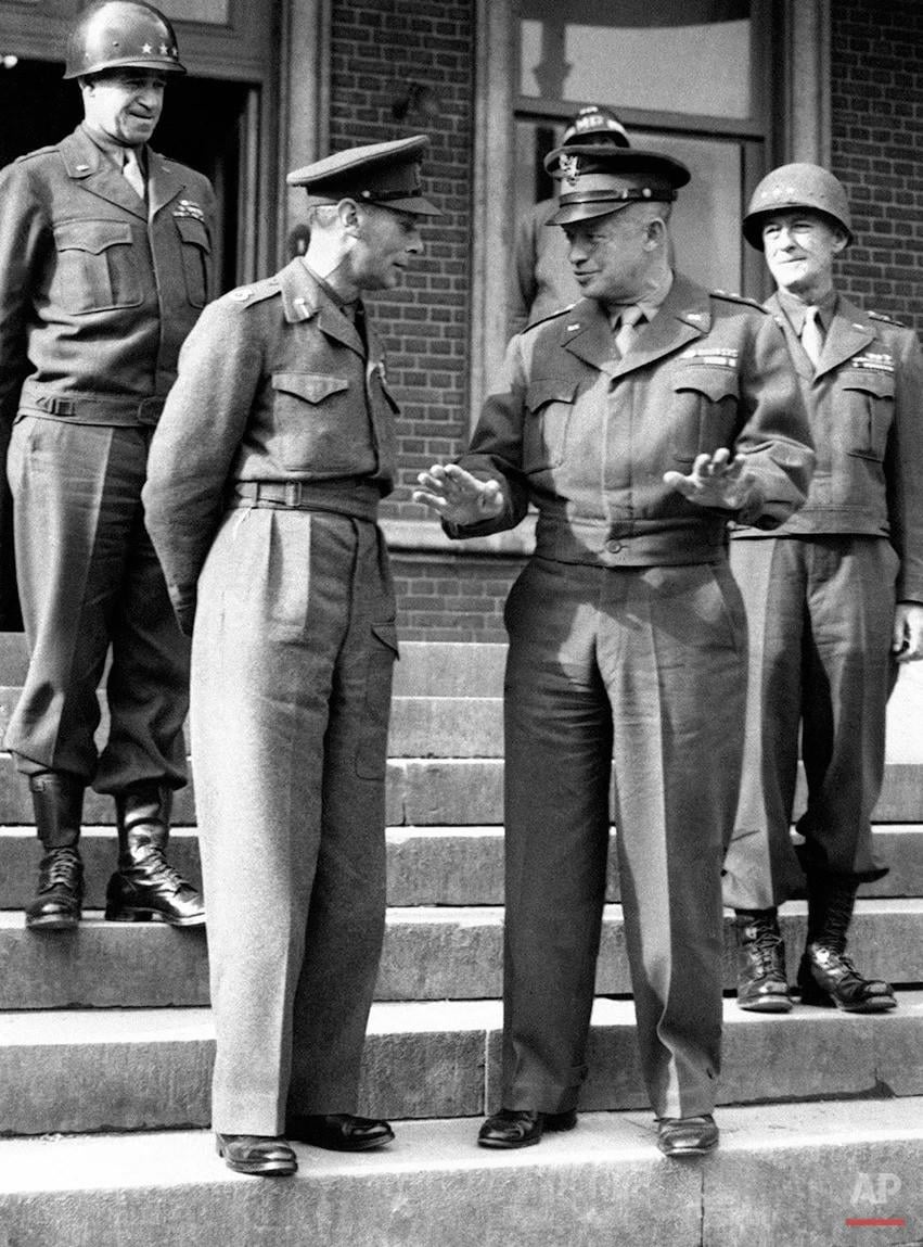 American General Dwight Eisenhower, right, relating an amusing incident to Britain’s King George VI, on the steps of the U.S. headquarters during his visit to the American front in France on Oct. 16, 1944. On left back is General Omar Bradley, and right General Courtney Hodges. [851 x 1149]