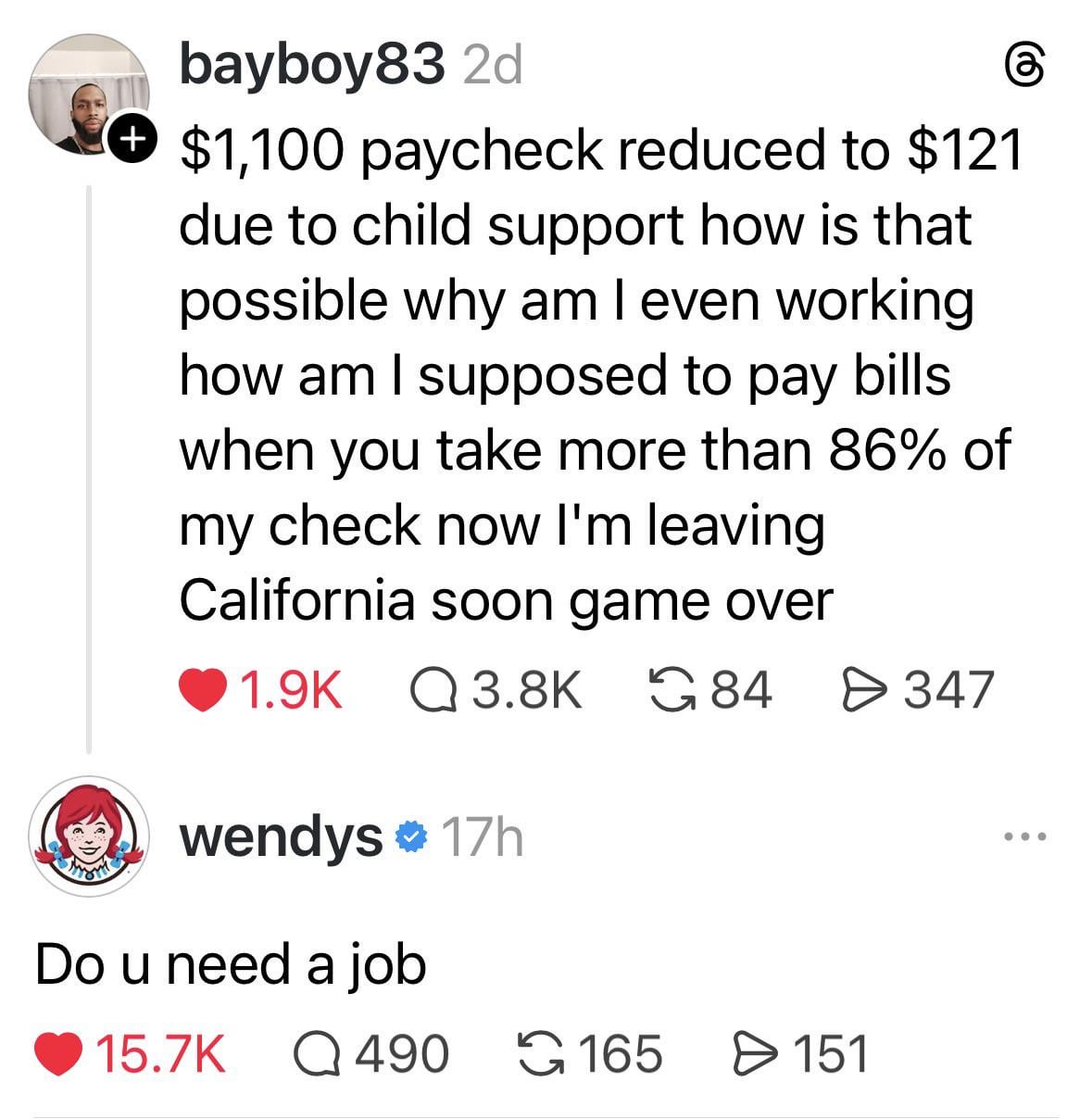 Sounds like he did some dumb shit with his dick and then decided he could try and swerve the child support, and now he’s been found, he’s paying child support and arrears…..FAFO.