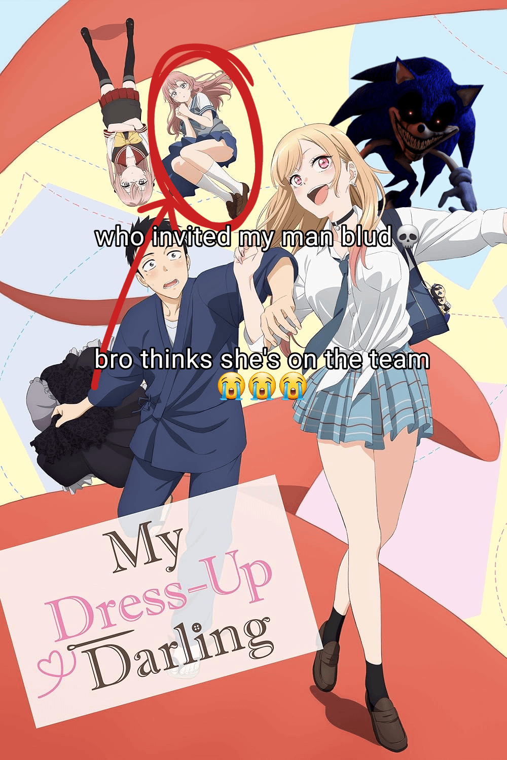 Bruh that dress-up darling girl ain’t from the same show fr, that’s some crossover anime fan art or something. Plot twist: bro’s clueless thinking she’s legit on the squad lmao.