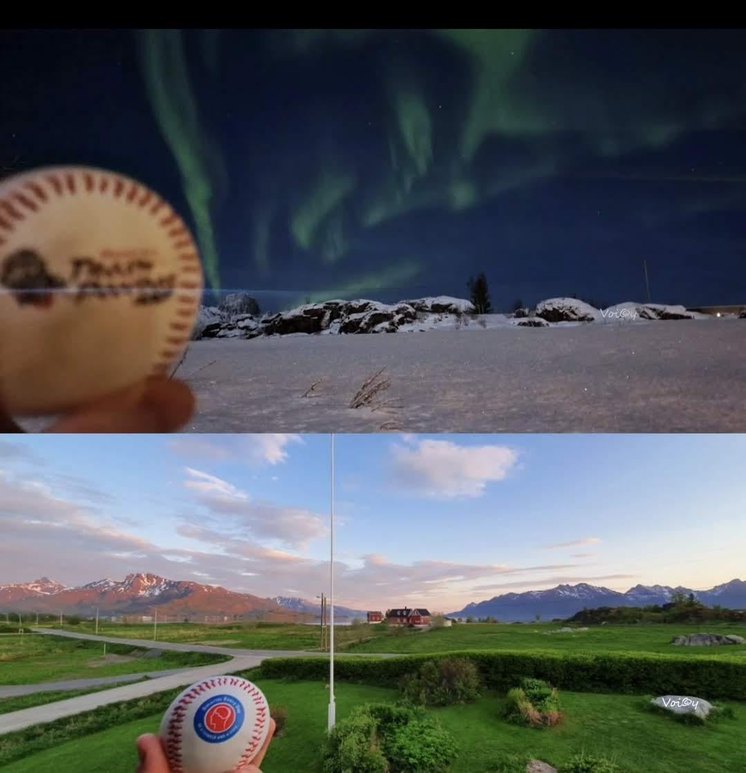 The baseball is such a perfect reference point. Midnight sun vs midnight aurora is wild to see side by side like this.