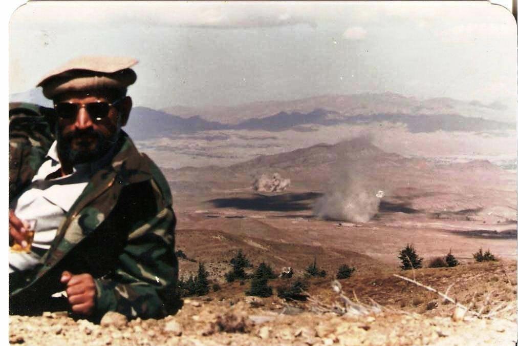 Spymaster Brigadier Yasub Dogar from Pakistan’s ISI enjoying qahwa (tea) on a mountain top in Gardez, Afghanistan whilst the Soviet ammunition depots are being destroyed in the background. Soviet-Afghan war, early 1980s, [1012×675]