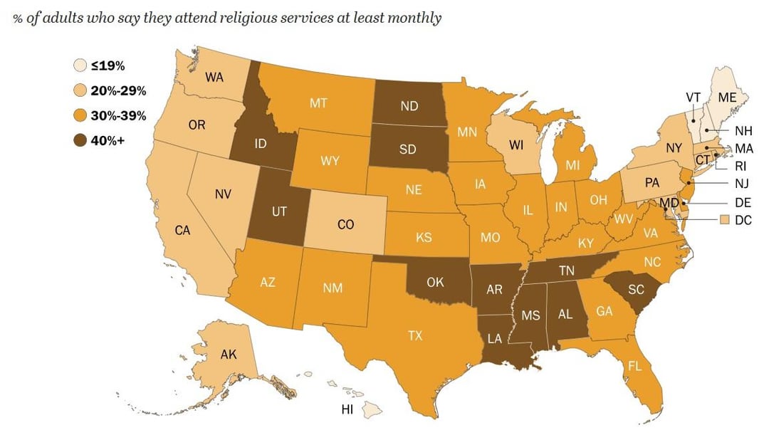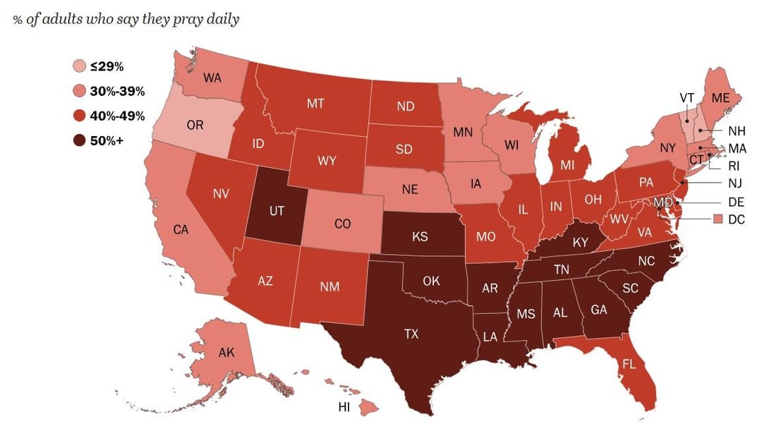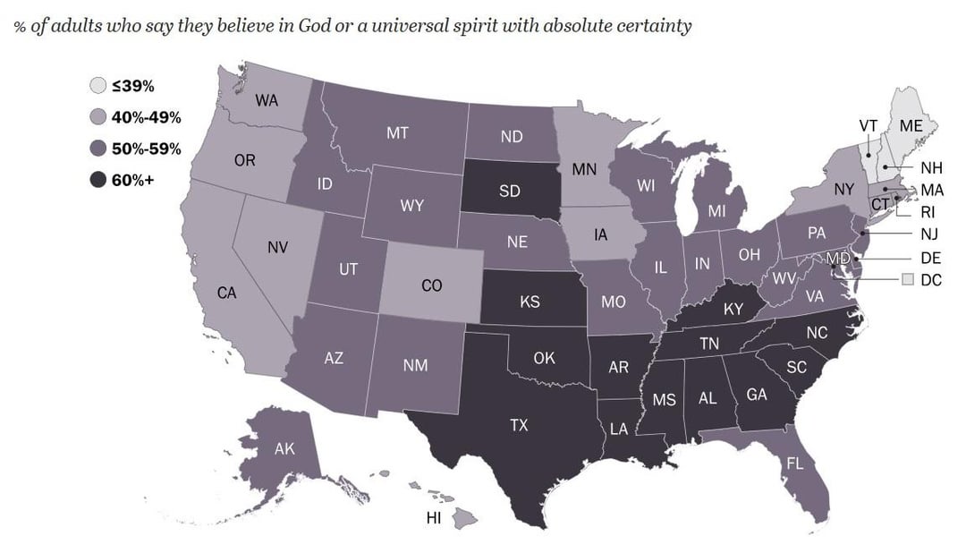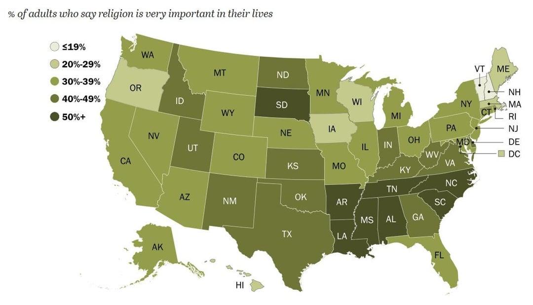 Religious Landscape Study of U.S. adults conducted July 17, 2023–March 4, 2024. Source: "How religious is your state?" (September 2025, Pew Research Center) by modooff