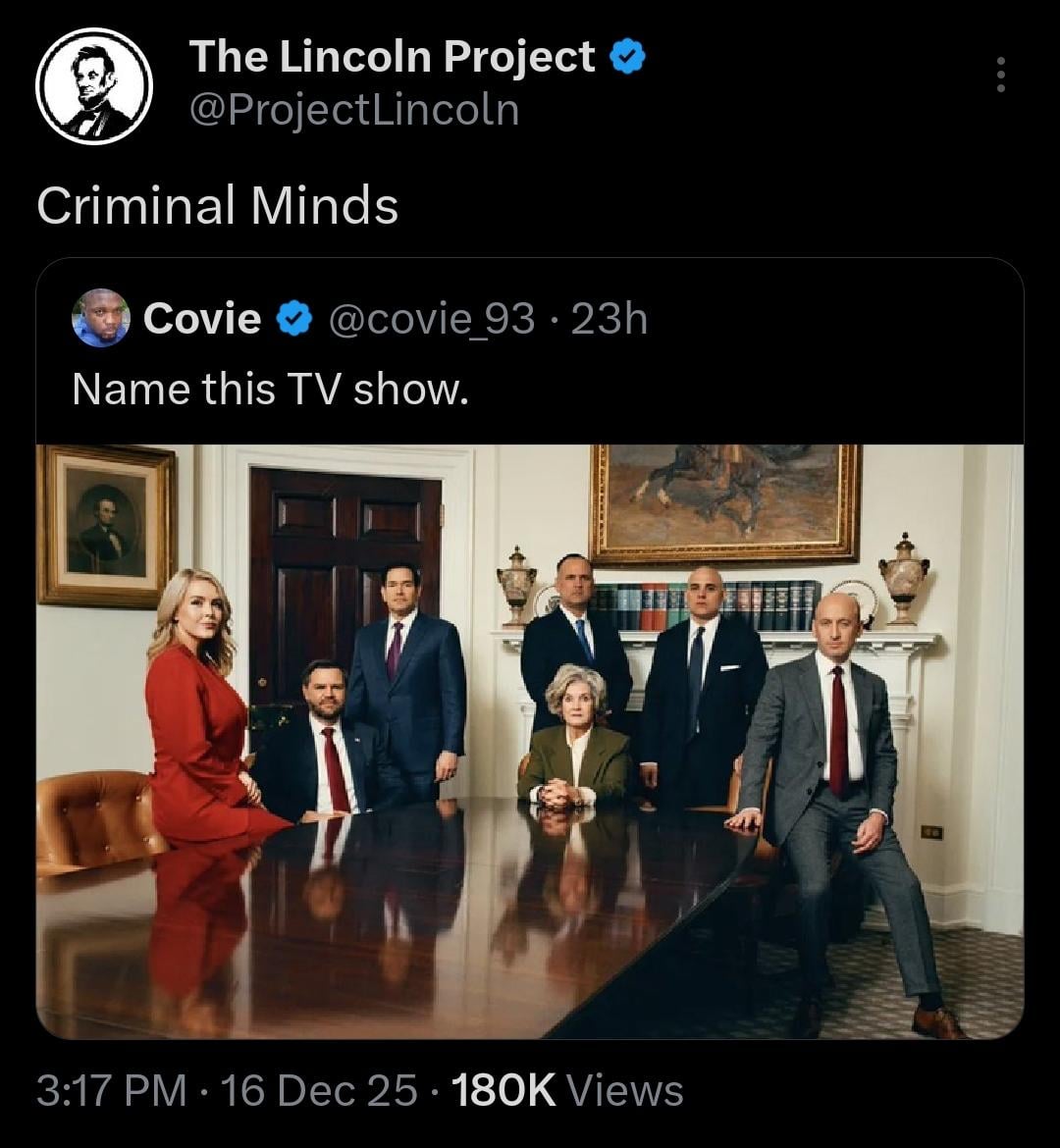biodude481 on December 17, 2025 10:36 pm Criminal Mind, singular. Because that’s what it adds up to for these jackasses.