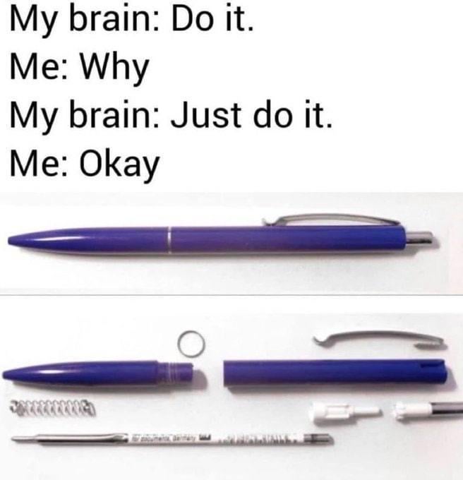 4. Did that in the middle of a test once. The teacher was very concerned. Then I put it back together and finished my test. My ADHD told me I had to take it apart