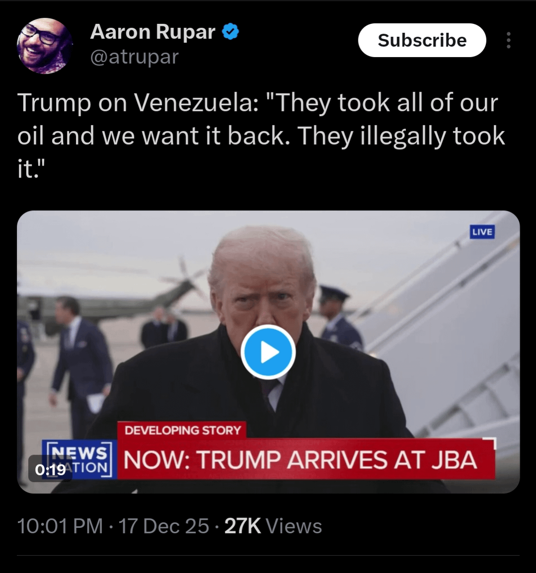 So, dummy-in-chief is mostly wrong, but there’s a kernel of truth. The fact that Trump is willing to go to war over this is insane. It’s Bush in Iraq all over again – the pretext of wmd’s (which there were none) to overthrow a country. Except, now, it’s “drugs” or something, and now they’ve just dropped the veil entirely and are justifying it because they “took our oil” is insanity.