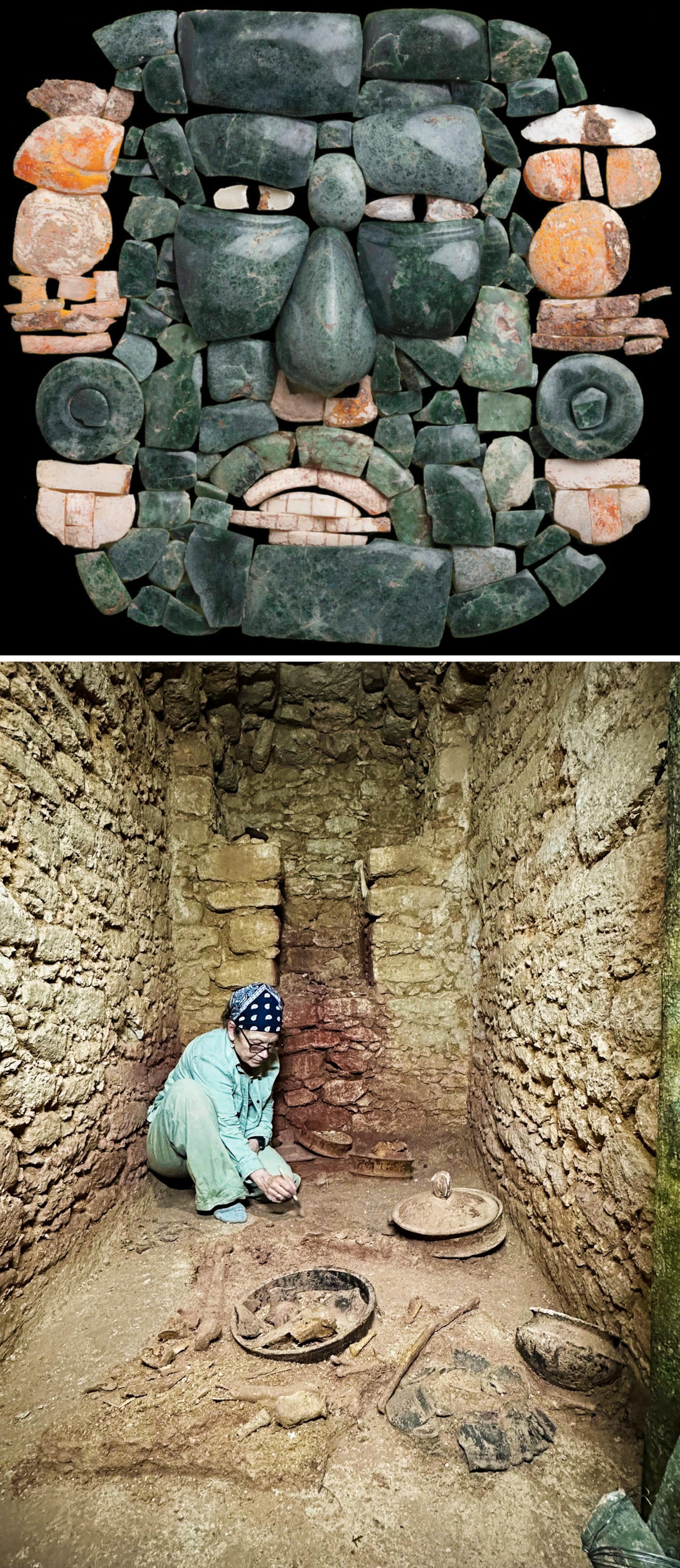 In one of the most important discoveries of 2025, archaeologists have uncovered in Belize, the tomb of the founder of the Caracol dynasty, Teʼ Kʼab Chaak. The most remarkable object from the tomb, was a jade-and-shell mosaic death mask that once covered the face of the Maya king. 349 CE [2304×5313]