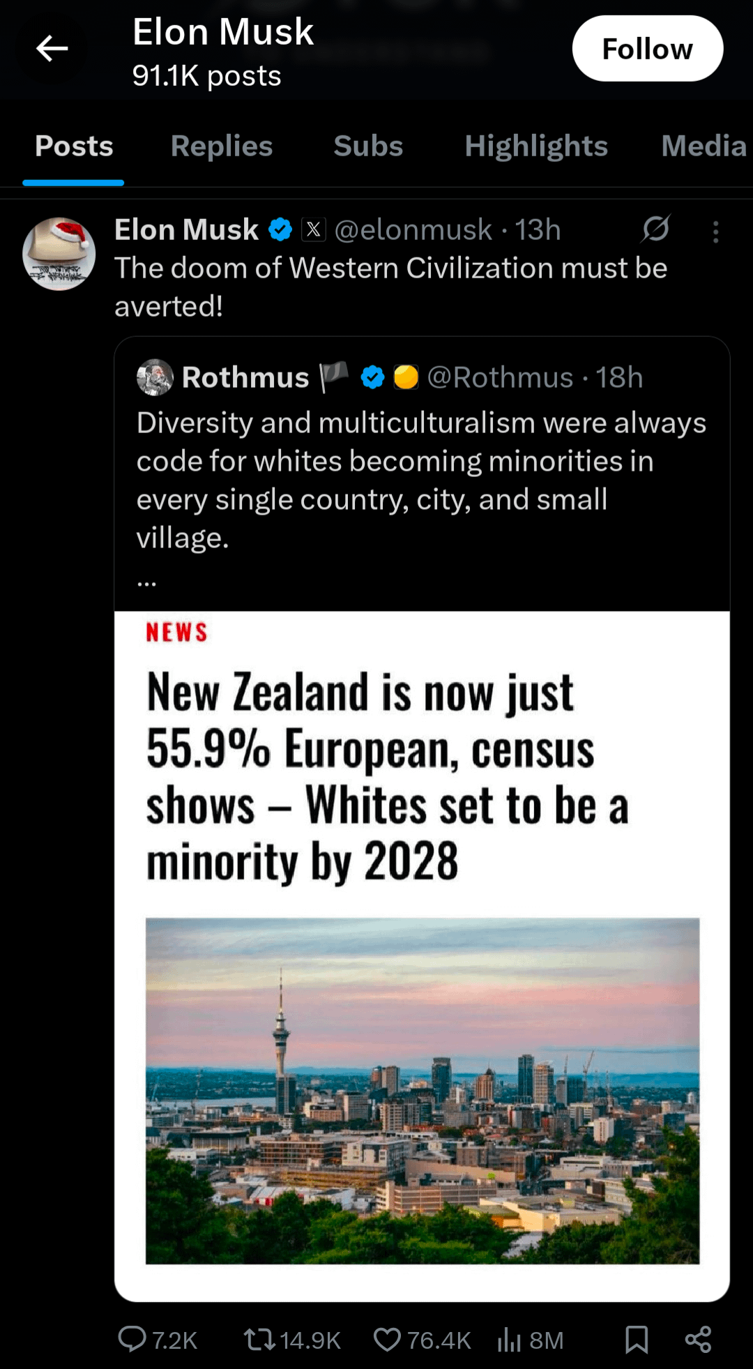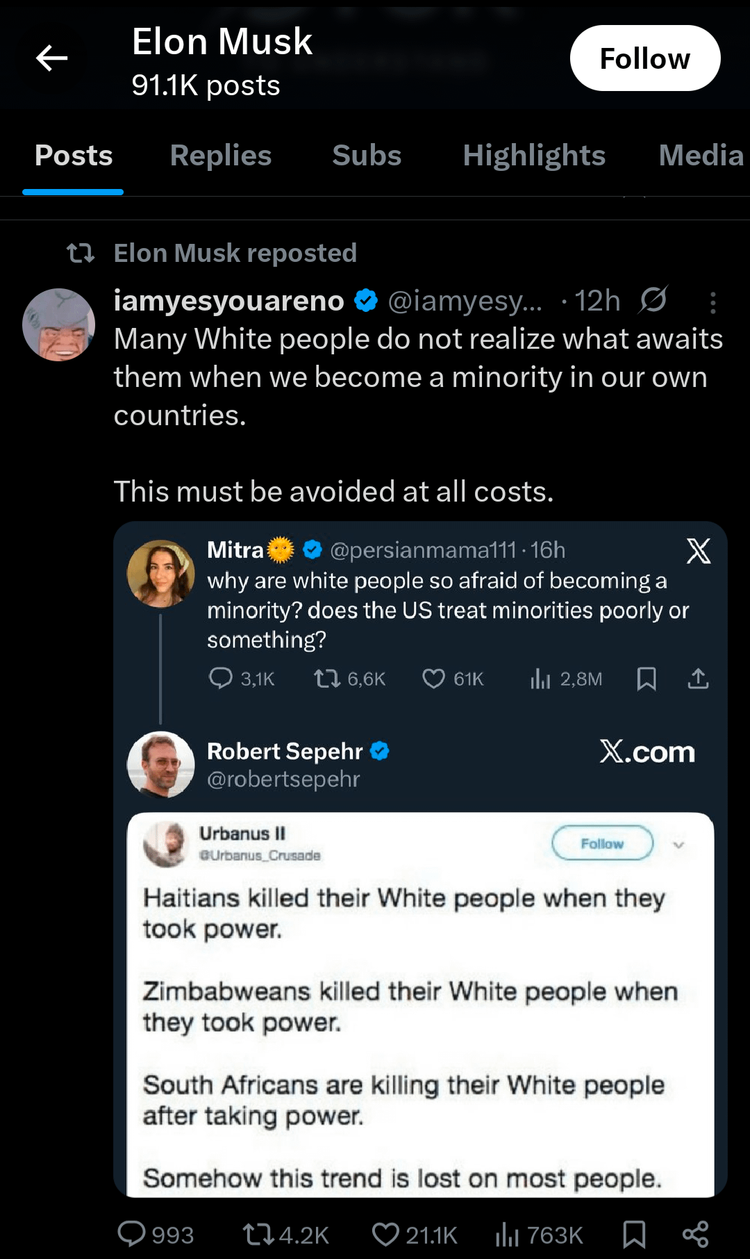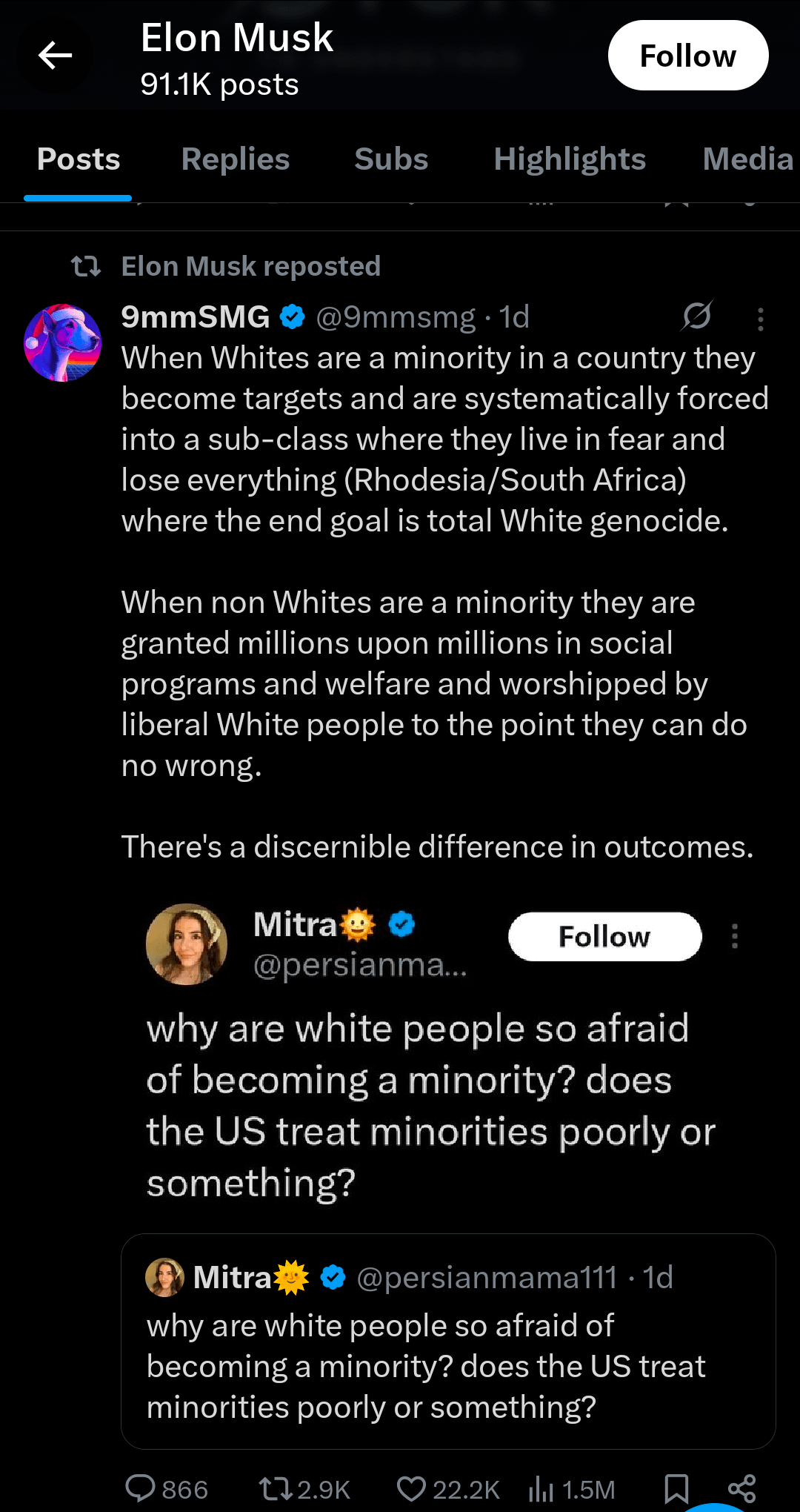 I know Elon has gotten flack before but these posts are particularly egregious. It's not even an implication at this point. His views on race are blatantly obvious now. When grok said something anti semitic it was in the bews but this gets no air time.