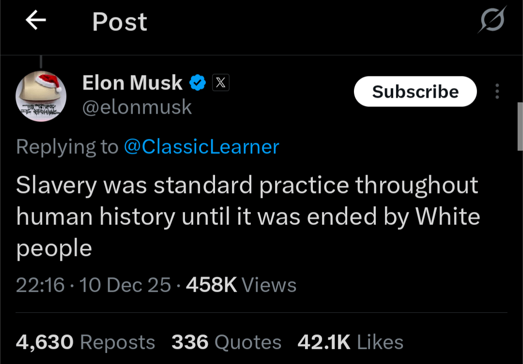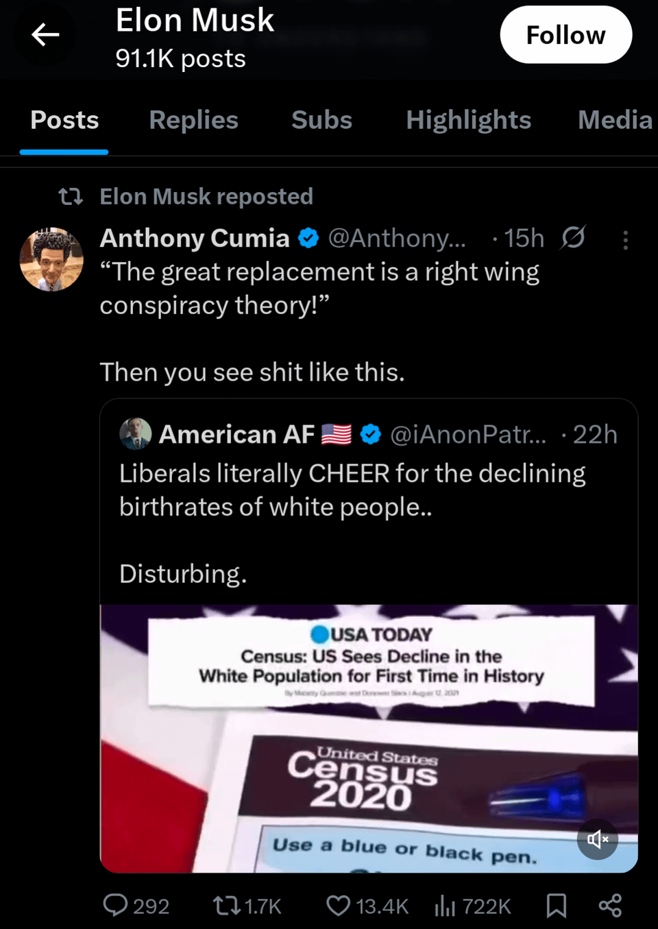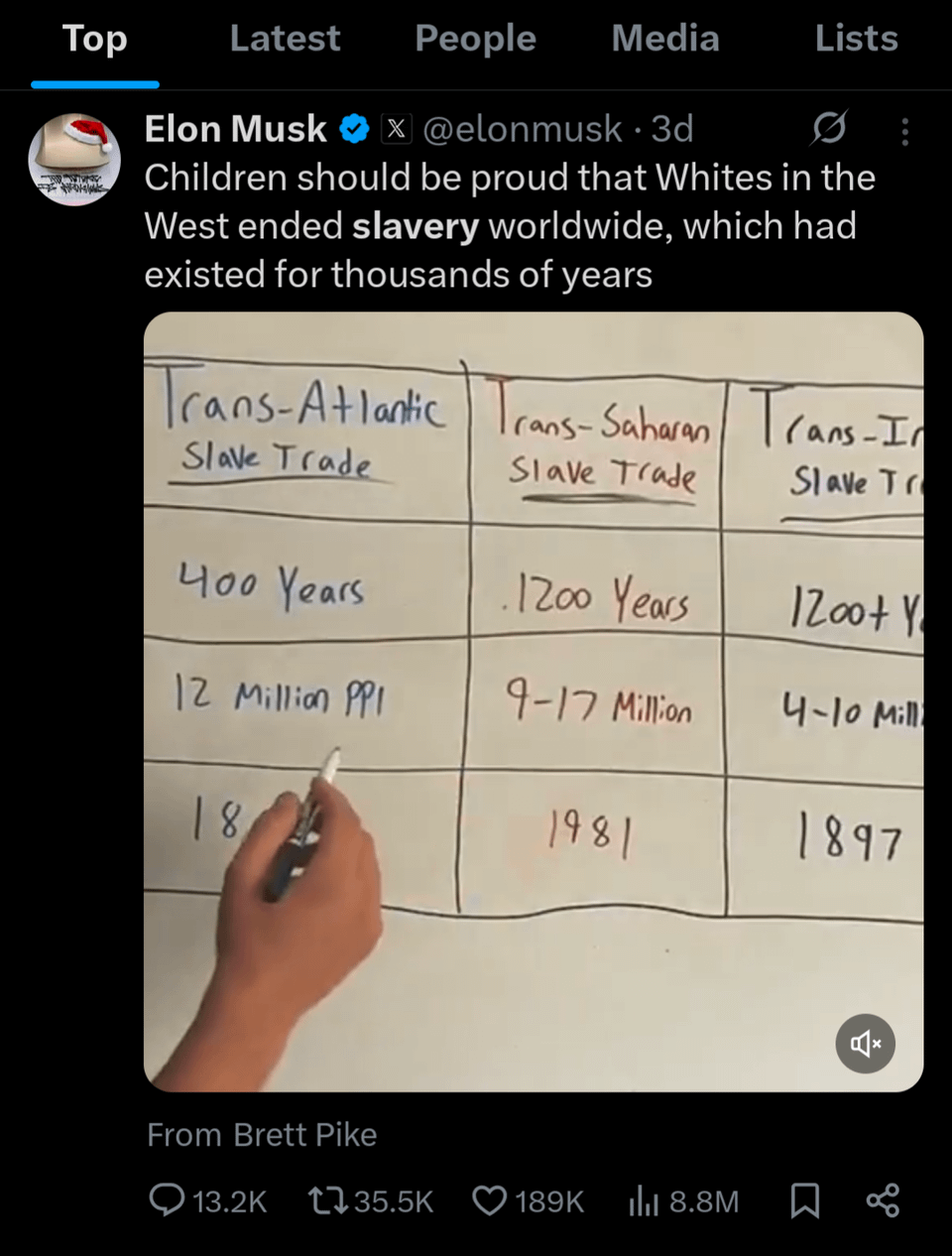 I know Elon has gotten flack before but these posts are particularly egregious. It's not even an implication at this point. His views on race are blatantly obvious now. When grok said something anti semitic it was in the bews but this gets no air time.