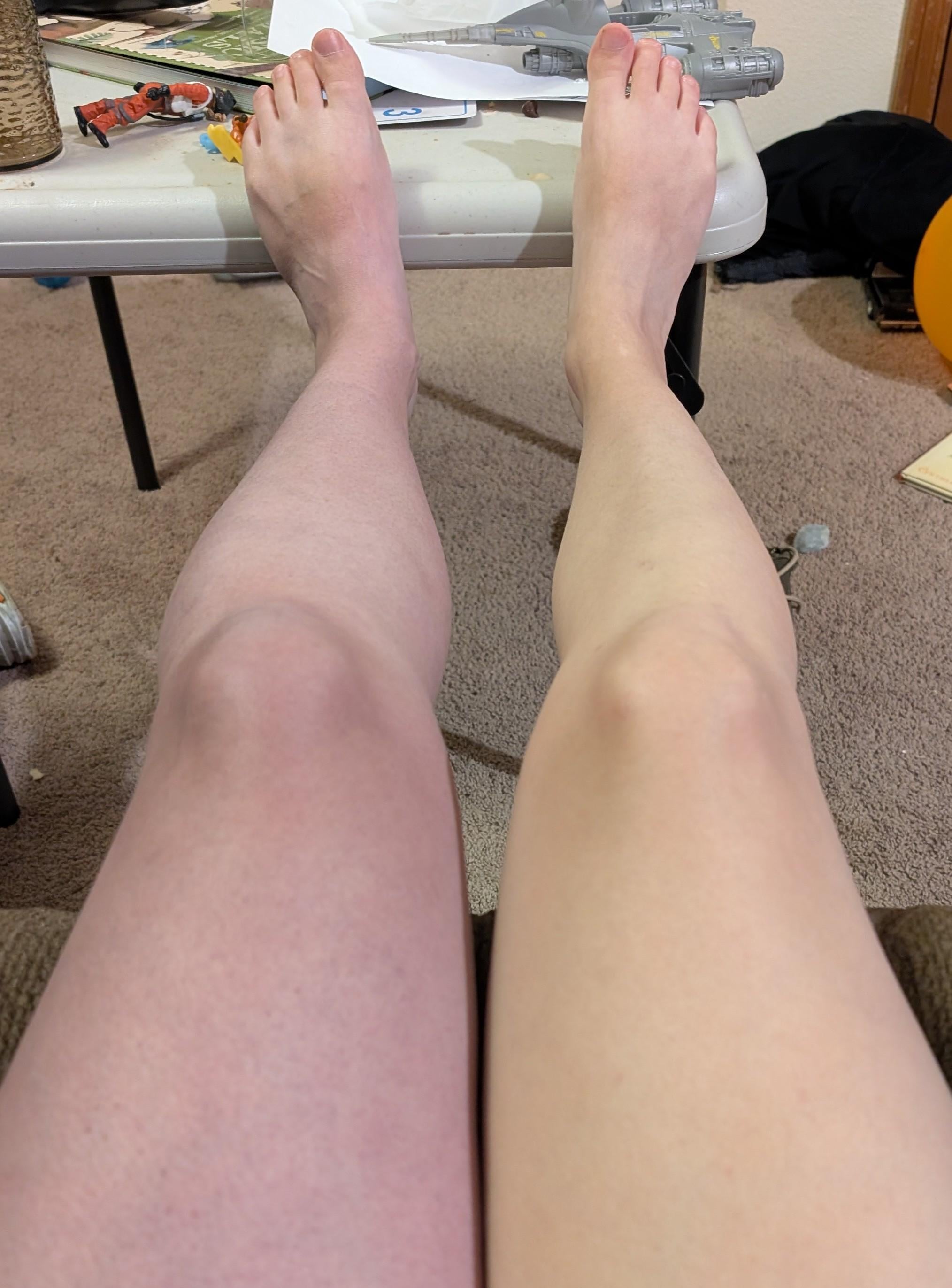 Edit to clarify: it’s the left leg. It was actually purple, but my phone camera made some rather poor decisions on the white balance.
