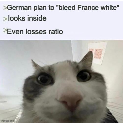 Unfortunately, as a side effect, it also degraded Germany’s fighting ability against everyone other than France. Which, in turn, allowed France to make up for losses by having its allies assume responsibility for longer stretches of the frontline.