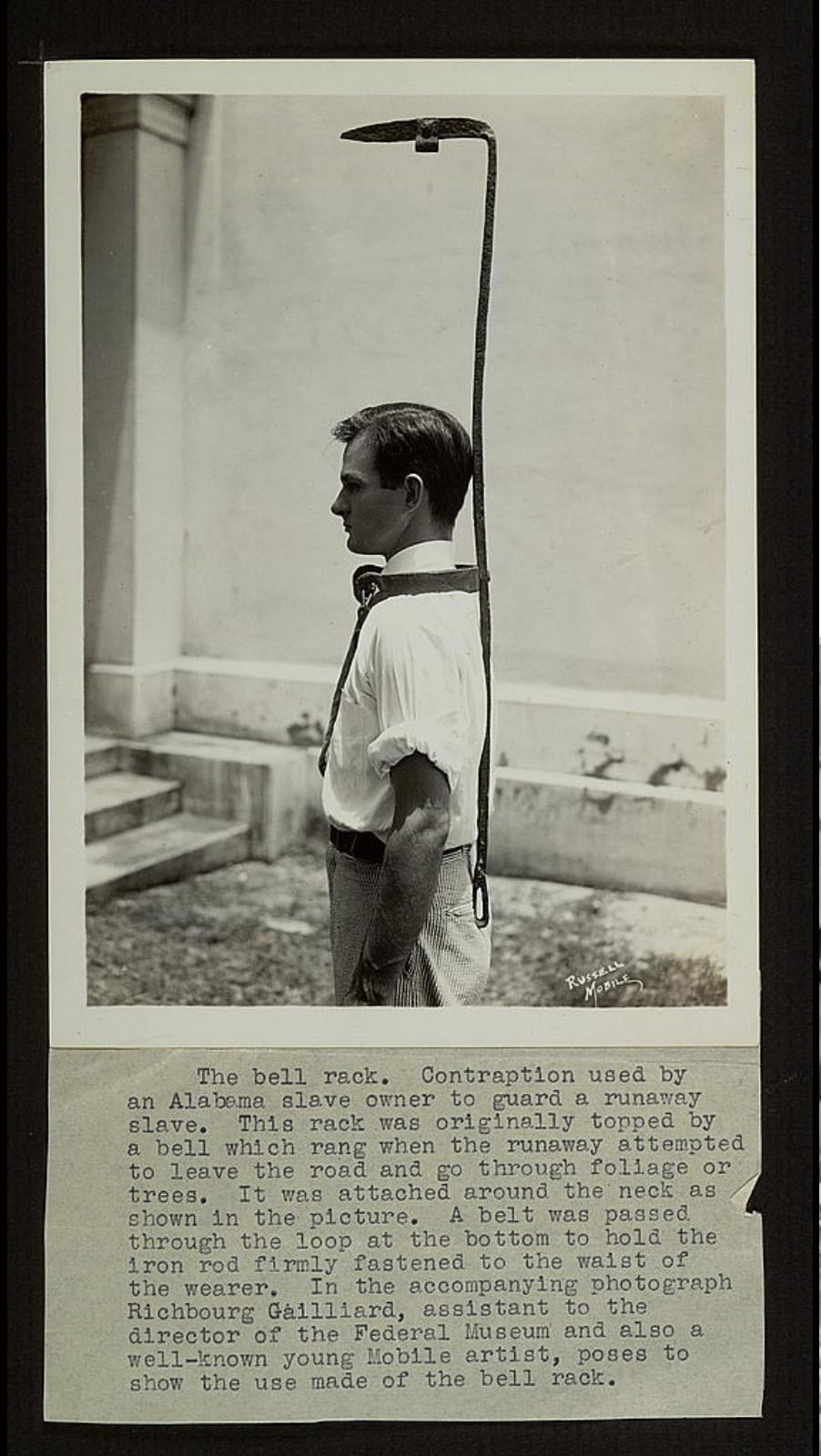Museum worker modeling the “Bell Rack” a device to stop runaway slaves in Mobile, Alabama, Photo circa 1937.