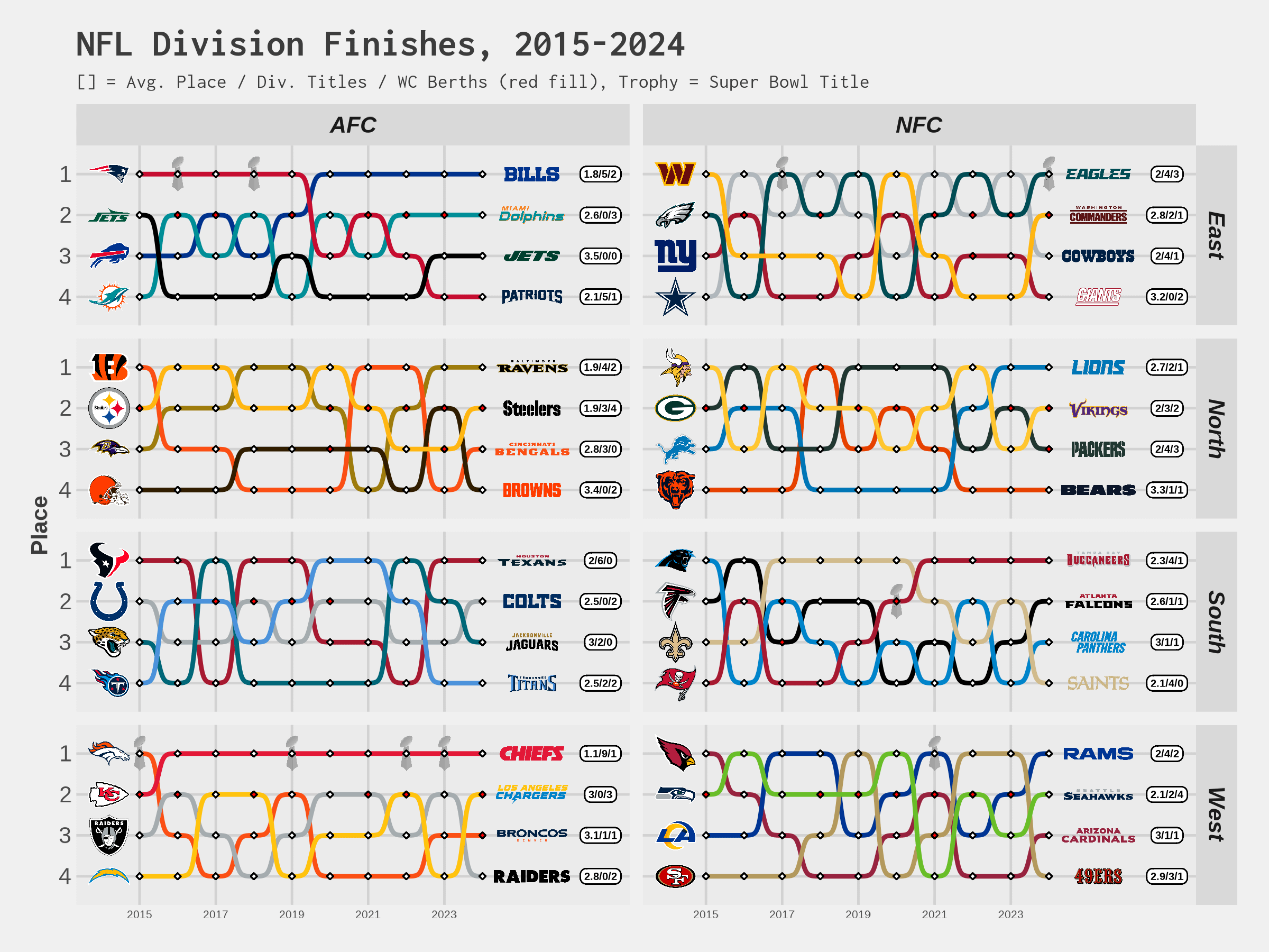 Something for the NFL enjoyers in here. Since last weekend included Patrick Mahomes tearing his ACL and the Kansas City Chiefs fully falling out of playoff contention, I thought I'd share this chart of team division finishes, which gives a peek into how consistently successful KC has been over the 10 prior seasons. For context, Mahomes took over as the starter in 2018.