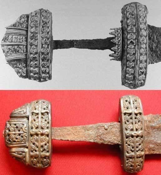 Two Carolingian-style swords from the early Middle Ages. The upper one was found in Dublin, Ireland, and the second in Gnezdovo, near Smolensk, Russia. I like how similar they are [516×558]
