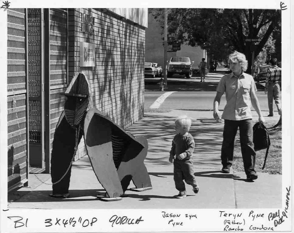 Sacramento, CA — Tenth Street. Teryn Pyne and his 2-year-old son, Jason, pause to inspect a mysterious plywood “urban gorilla” chained outside the Sacramento Metropolitan Arts Commission offices (1985)