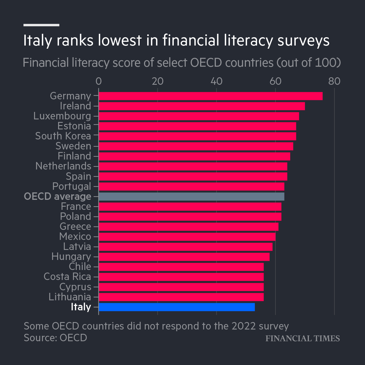 Italy has the least financially literate population among developed nations surveyed by the OECD. Fewer than four in 10 Italians can correctly answer questions about basic concepts like inflation, compound interest and risk diversification.
