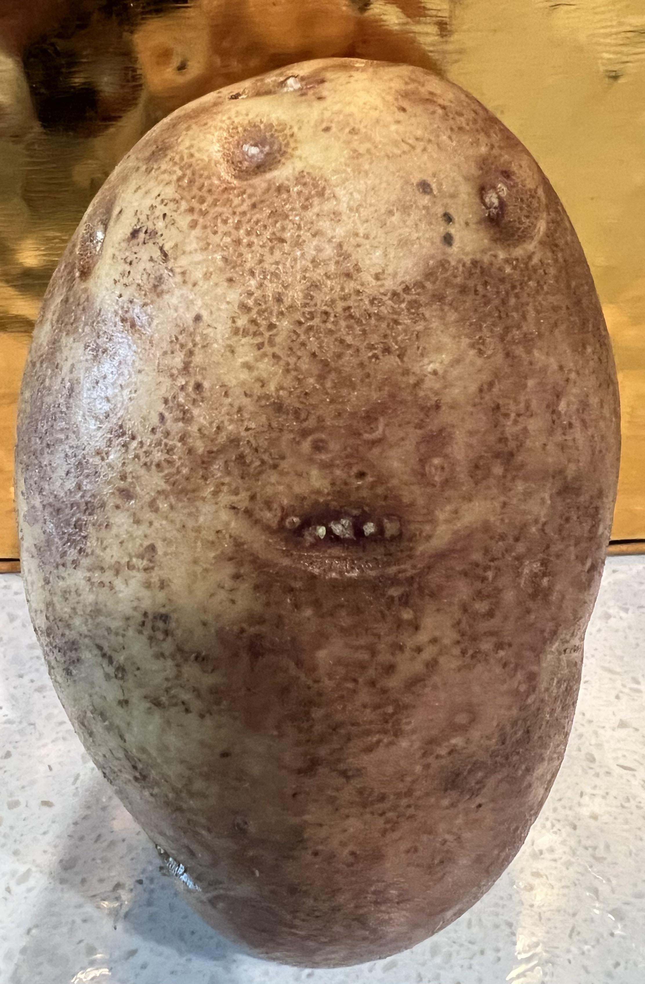 This is one of the potatoes from last night‘s dinner. Is it my imagination or does it have a weirdly human-like face with a wonky set of teeth? by IBelieveInMe1