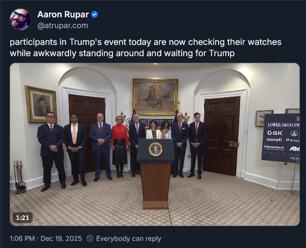 [As of now, they are still waiting. The event was supposed to start over an hour ago.](https://bsky.app/profile/atrupar.com/post/3maefjlj5wp2o)