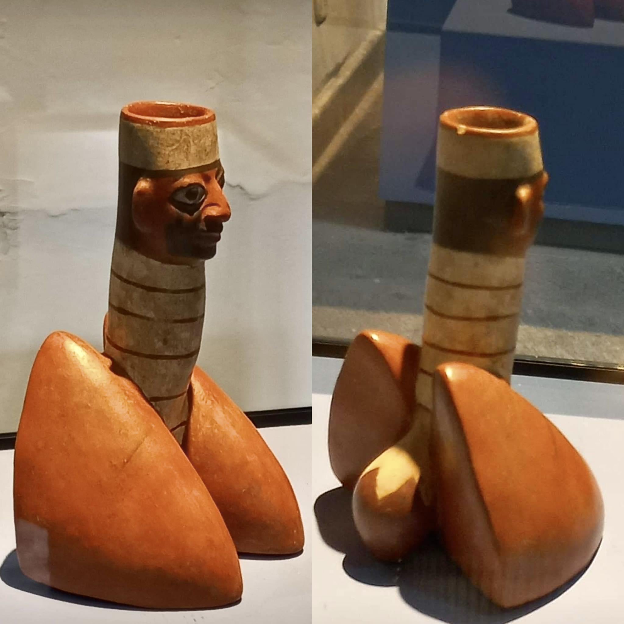 Found during excavations by archaeologist Jose Ochatoma in Ayacucho, Peru, this Wari ceramic piece represents the cardiorespiratory system, showing the trachea connected to the lungs and heart (positioned at the rear of the bottle). Wari culture (6th-10th century CE) [2048×2048]