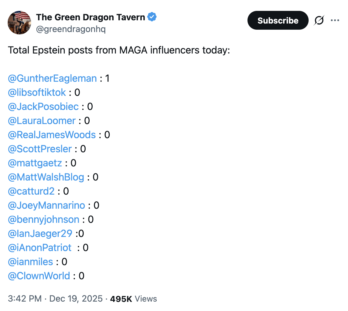 bad10th on December 20, 2025 4:15 am How many of these folks denied these files existing? Silence can be golden! Saw some lame talking it down saying there is nothing there or ALL CLINTON. Bot vibes? Yeah, how could you only see Clinton unless you didn’t look?