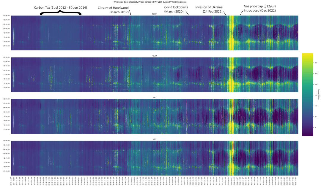 Note that wholesale electricity prices can go as high as $22,000 AUD/MWh or as low as -$1,000 AUD/MWh. These extremes are rare so the colour range only caters from the 2-98th percentiles, with prices below or above just hitting the end colours.