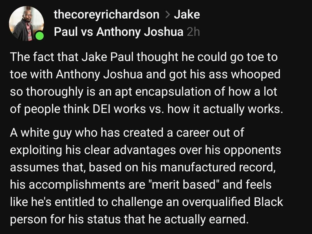 I don’t think this has anything to do with DEI and I don’t think anyone thought Jake Paul had a snowballs chance in hell of winning this fight, including Jake Paul himself.
