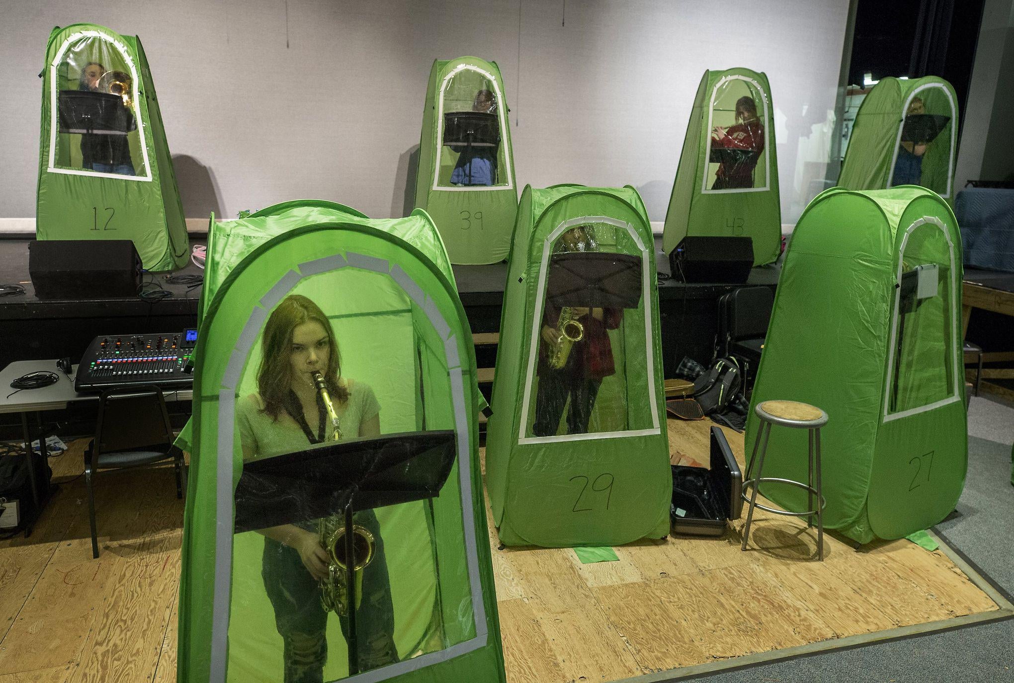 My son had to put a cover over the bell of his saxophone and cut a hole in a mask for the mouth piece. It was ridiculous