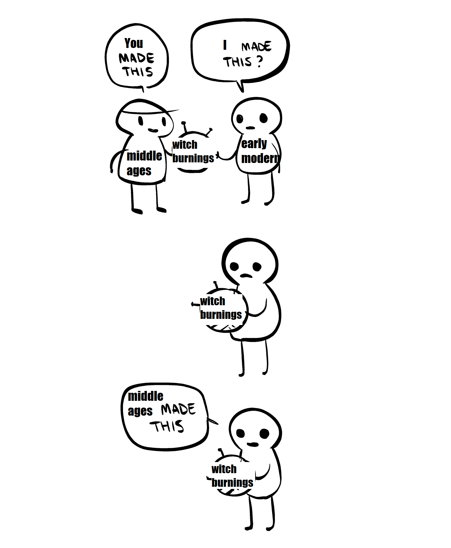 One of my favourites part of this is the one that point catholic institutions as the one that prosecuted witches when it usually was a state of decentralized civil delirium.