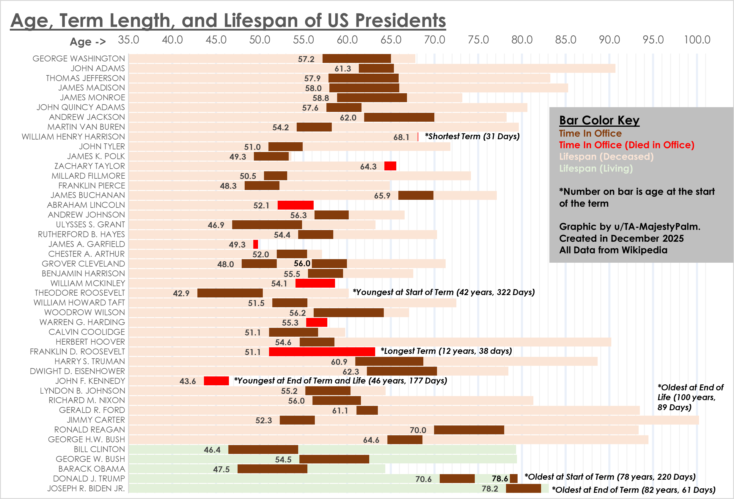 Graphic by me, created using Excel. All data from Wikipedia here: https://en.wikipedia.org/wiki/List_of_presidents_of_the_United_States_by_time_in_office and here: https://en.wikipedia.org/wiki/List_of_presidents_of_the_United_States_by_age