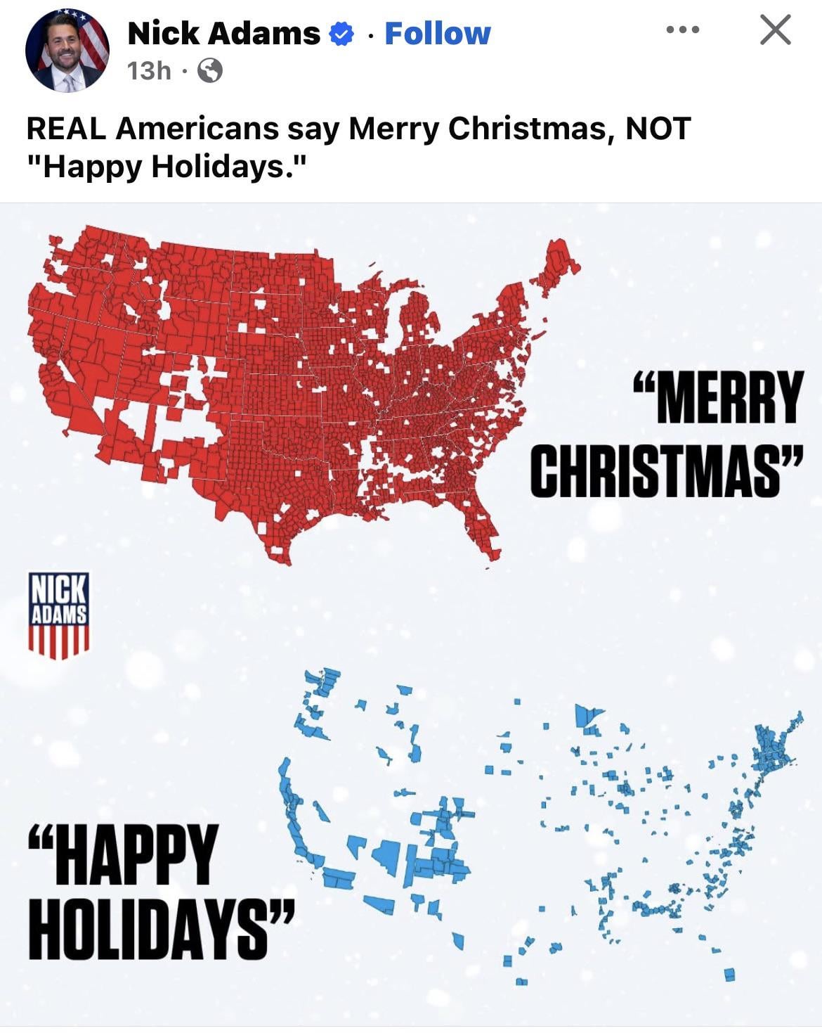 I don’t know, I moved a few years ago from happy holiday area to the merry christmas area. People here are a lot nicer an frankly have as culture and education as the blue areas when taken as a whole.