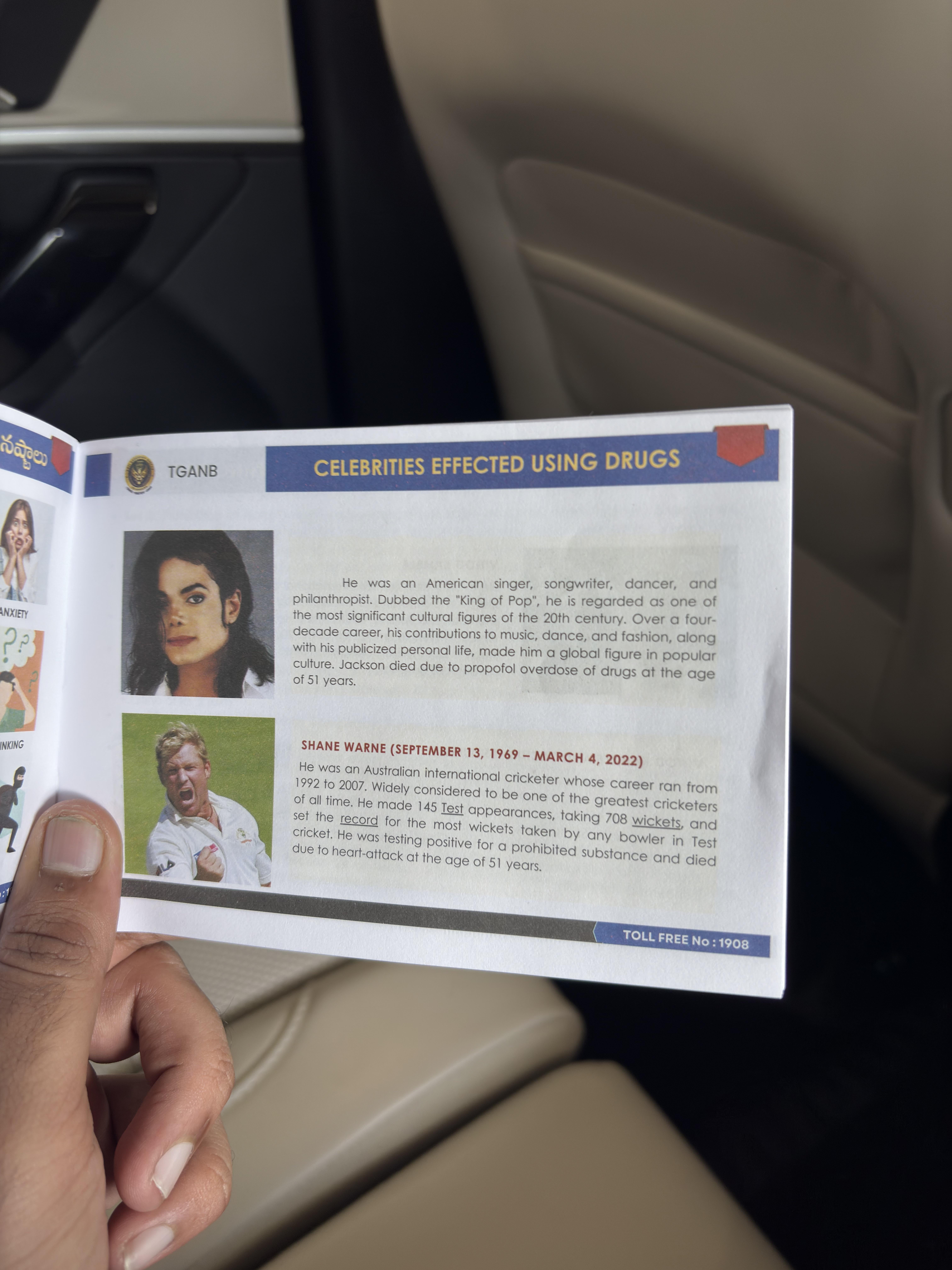 This is a pamphlet that the police of my city, Hyderabad, in India published to spread awareness on the dangers of drug abuse, and in a section that highlighted lives destroyed by drugs, they used Michael Jackson.