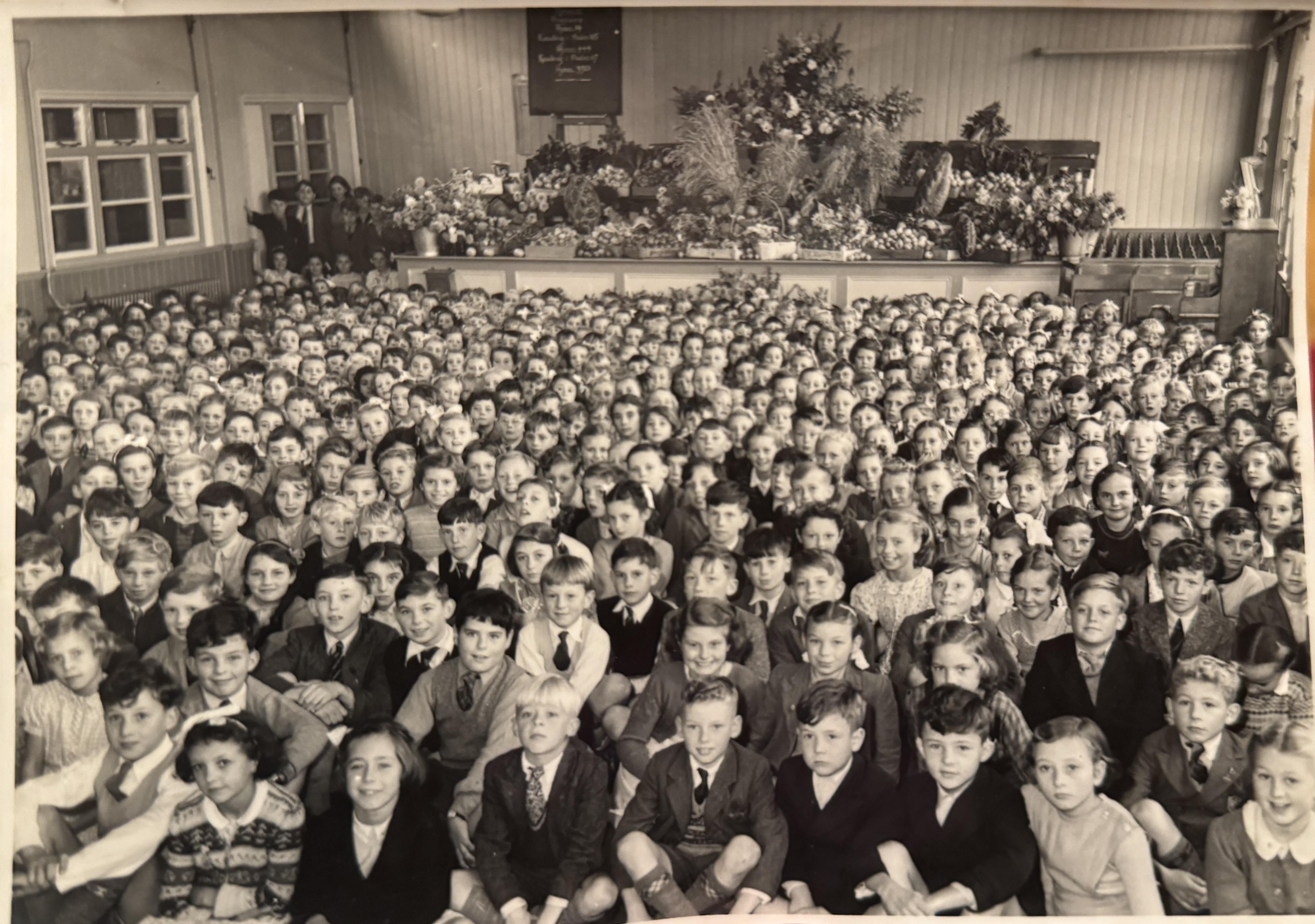 Looks like they’re in an auditorium, background is a stage with festive foliage and food. Usually class pictures are in a classroom and the name of the school and year is printed on the bottom. I just don’t recognize this as a classroom. Maybe your dad’s class was separated into different groups/teachers and they were put together for the group picture in the auditorium?