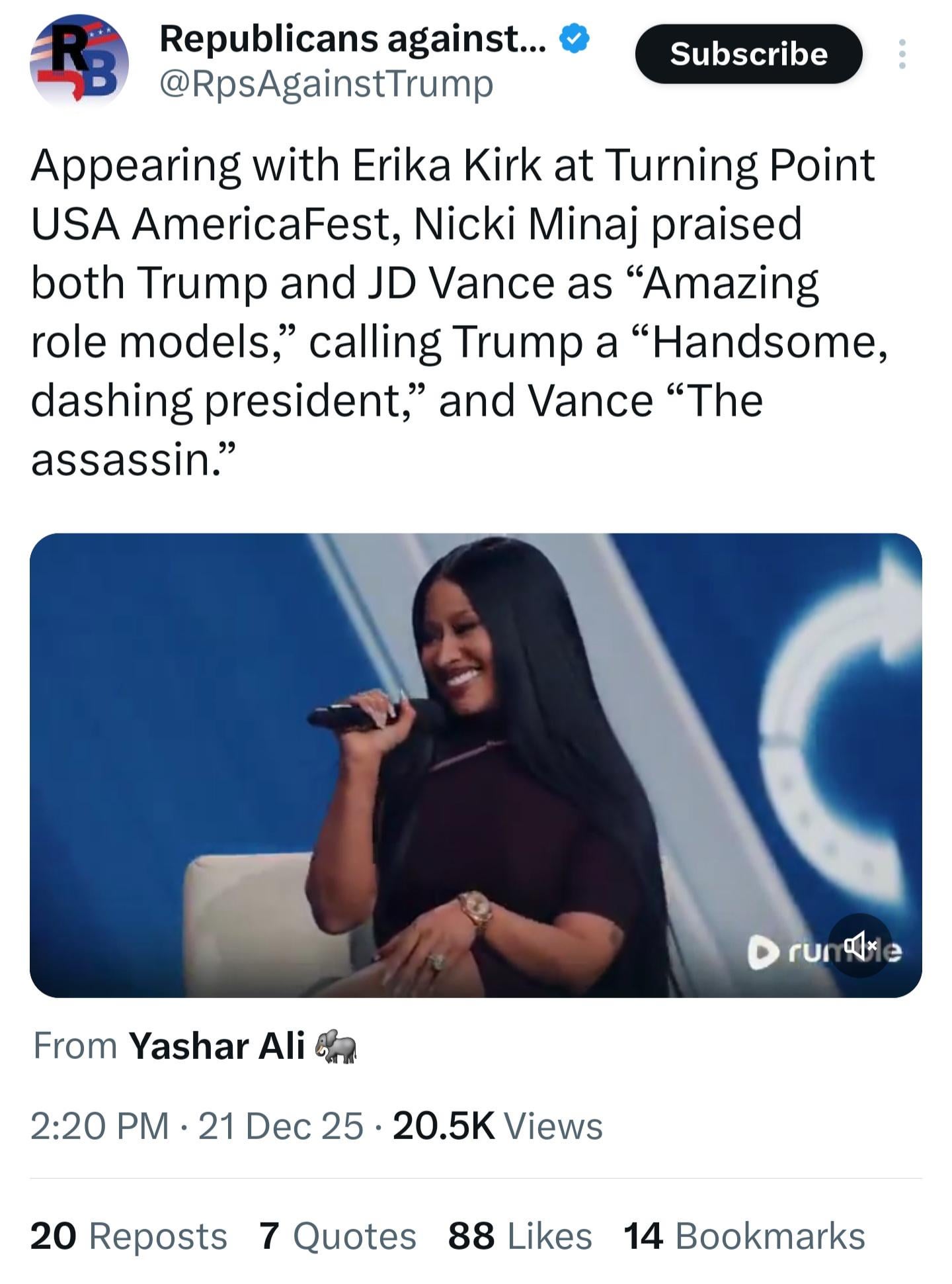 Like…what weird demographic would even listen to Nicki Minaj MAGA rap? Does she even have a fan base now?