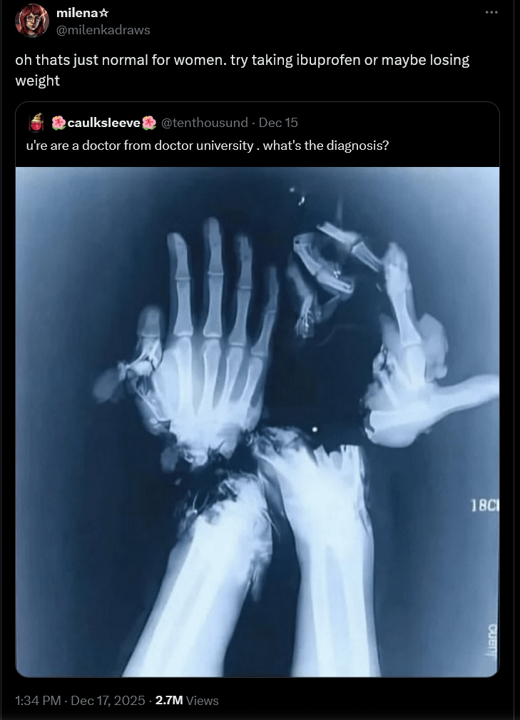 Obviously this is an extreme exaggeration, but yes. I was telling a male friend how angry I was that I couldn’t get painkillers for my debilitating back injury, and he told me he was always prescribed painkillers. I could barely walk at the time, was eventually bedridden for two weeks before my surgery, and they had my MRI films. But sure, it was all in my head.
