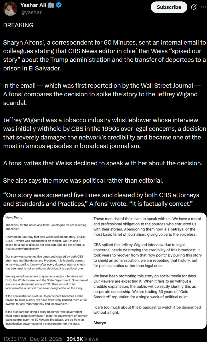 6. A Murdoch-owned outlet reporting on CBS/Bari Weiss/Larry Ellison’s censorship tells us a lot of about the media landscape in 2025.