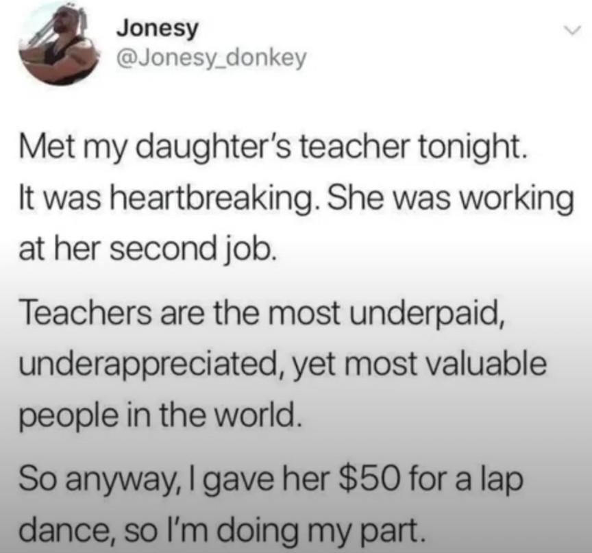 My brain read this as “my daughter, who’s a teacher” it made the post arguably more hilarious but vastly more disturbing