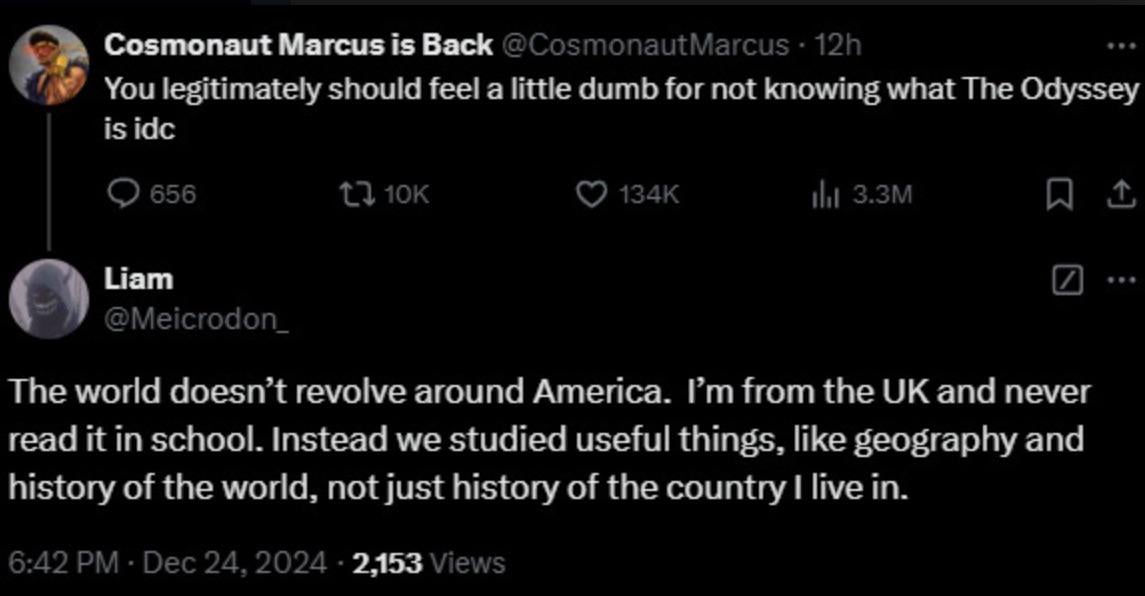 Ah yes I can think of nothing more American than the Odyssey, it’s right next to the declaration of independence when Nicholas Cage steals it.