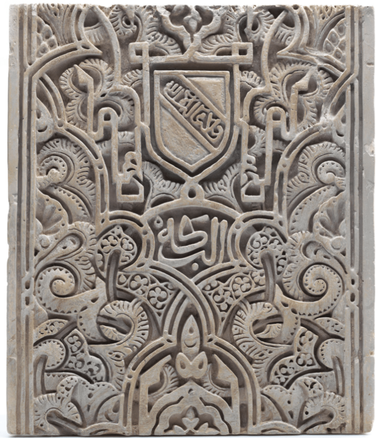 The shield contains the words ''wa la Ghalib ila Allah', 'no Victor but God', the motto of the Emirate of Granada. Below the shield, surrounded by floral patterns, is the word 'al-Barakah', 'blessing'. by Bnedem