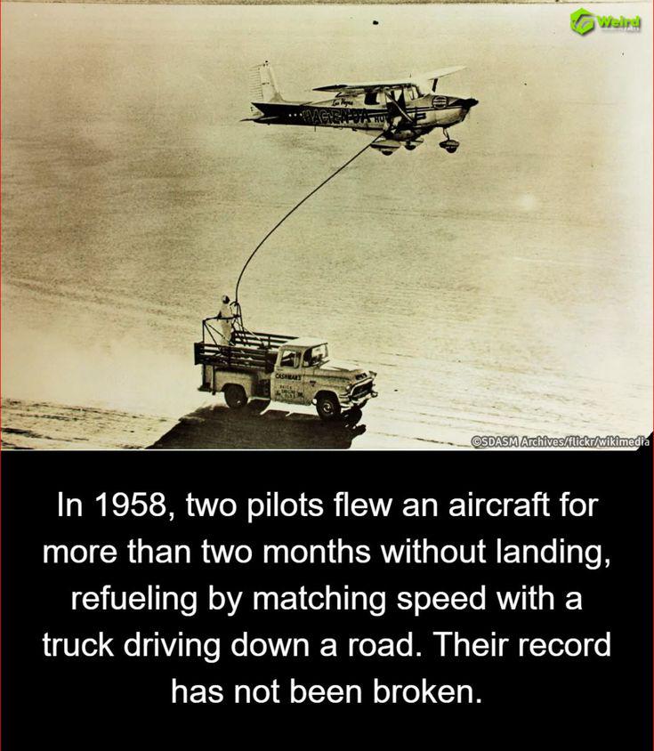 Method: They performed mid-air refueling and supply drops (food, water, oil) from a truck driving below on a highway.