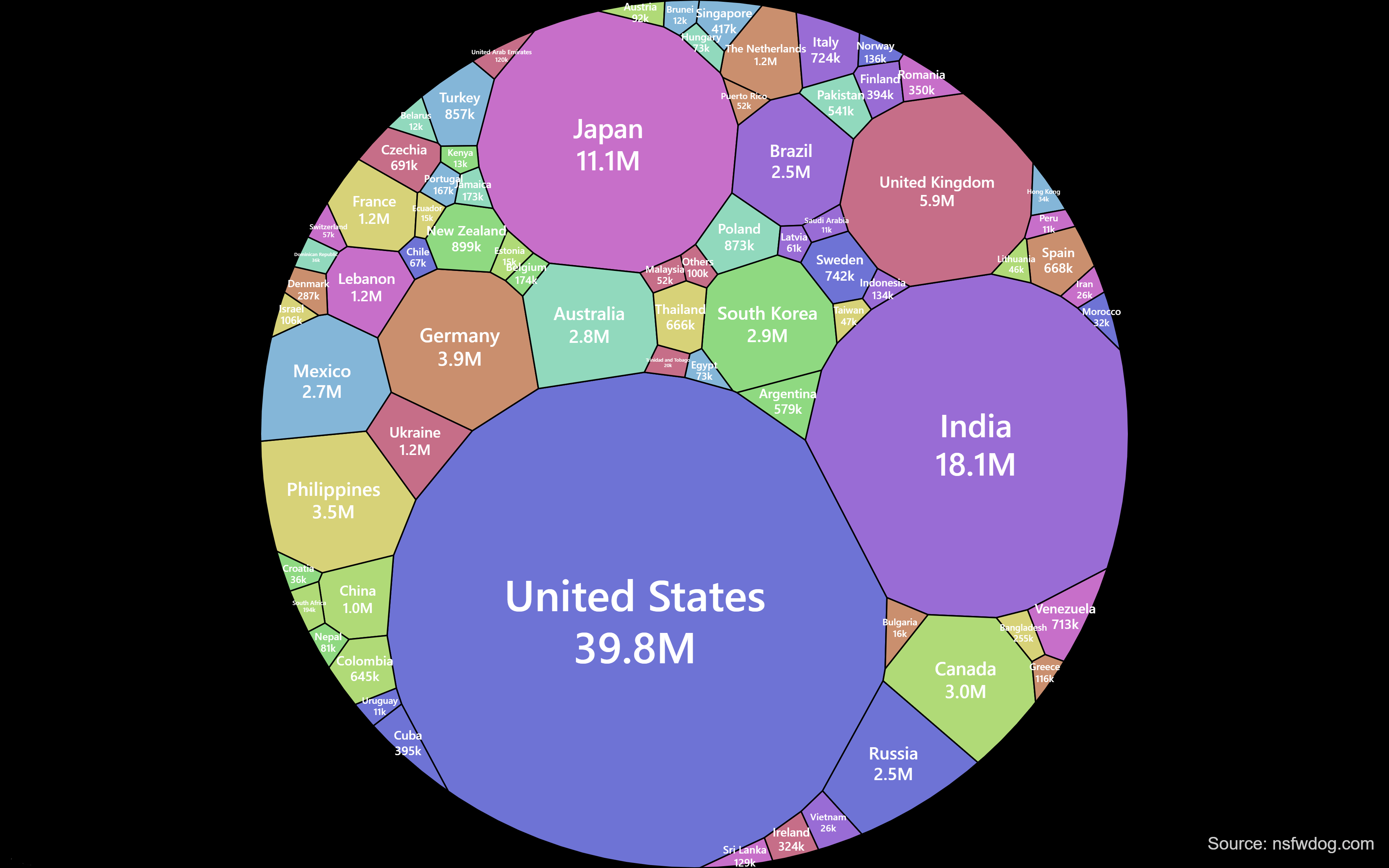 This chart essentially sums up the subscriber counts for NSFW communities dedicated to specific countries (including states, cities, or areas within that country), such as r /Gonewild[Country] or r /[State]NSFW.