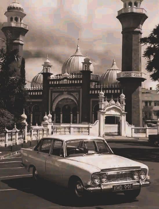 A Ford Zodiac Mark III posed in front of the classy Jamia Mosque in Nairobi, featured in promotional material ahead of the 10th East African Safari Rally. April 1962.
