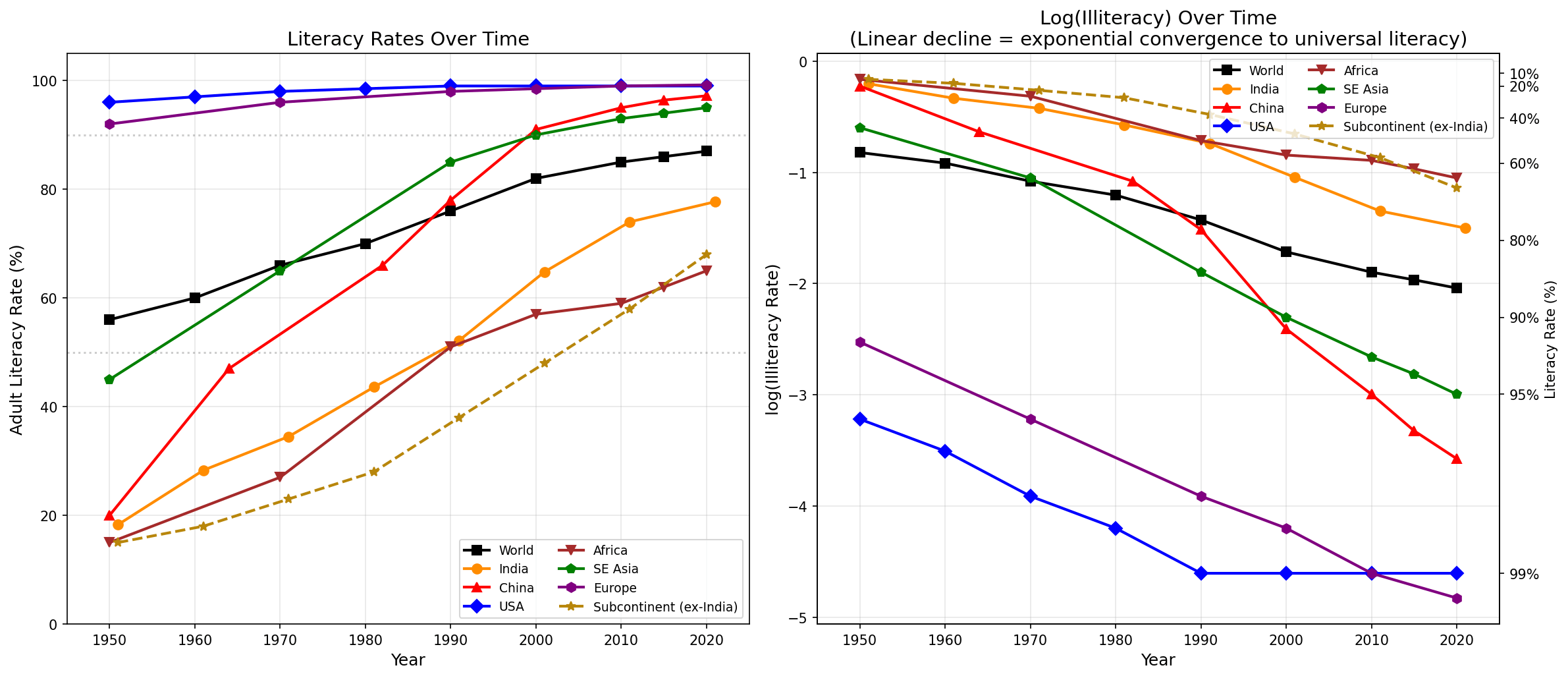 Neither your scale nor your data are suitable to plot “exponential convergence to universal literacy”. As you can see, data for the US appear to have a peak 1% precision, so the literacy rate peaks at 99%. Further precision would be illusory anyway if you go to the source data websites (which you do not cite), because literacy generally has to be measured on a spectrum of competencies. Comparing data across countries/continents in this manner thus is further problematic if you’re not taking this into account.