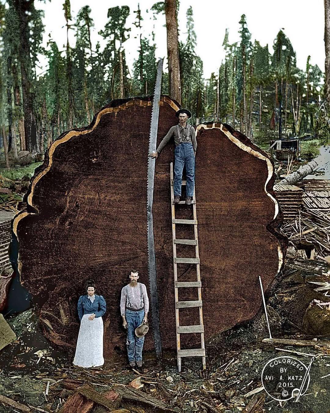 A family poses in front of a 1,341 year old Sequoia tree nicknamed “Mark Twain” that was felled in 1892 after a team of two men spent 13 days sawing it in the Pacific Northwest. The giant tree was 331 feet tall (100 meters).[1080 × 1351]