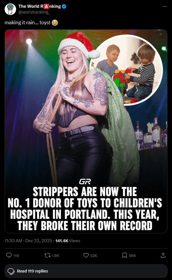 I believe that. How many strippers have struggled or are struggling now? Which ones are single parents, or raised by single parents? I’m sure many of them were disappointed by Christmas or was excited for that one toy when they weren’t expecting anything. Strippers donate because many of them have been there.