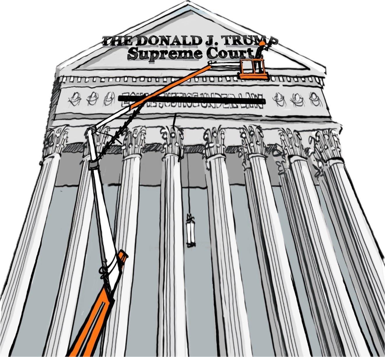 1. Since he’s putting his name on buildings we own, doesn’t it mean we can put our names on properties he owns? Above his? And demand he pay us for the privilege?