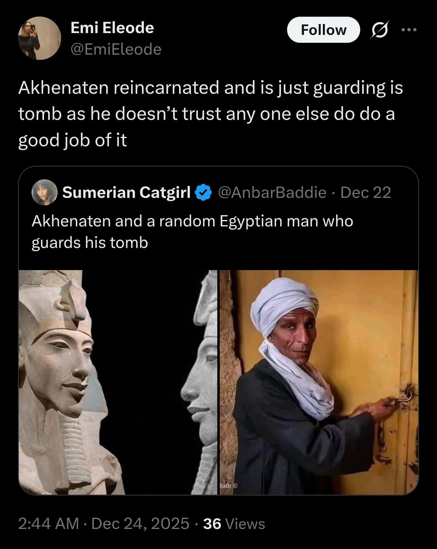 ReadComprehensionBot on December 24, 2025 6:31 am Don’t let Tariq Nasheed see this or he’ll accuse that guy of being a fake Egyptian lmaoÂ
