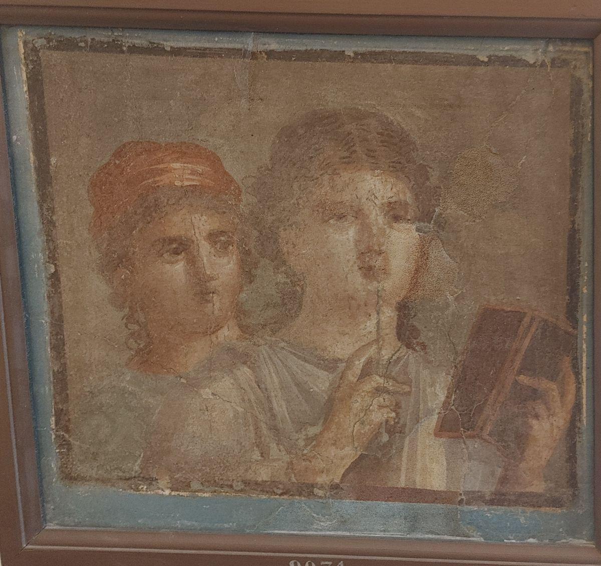 Roman fresco from Herculaneum showing two young women, where one of them holds a wax tablet and a stylus for writing. Object dated to the 1st century CE. The artifact is in the National Archaeological Museum in Naples. [1200×1130]