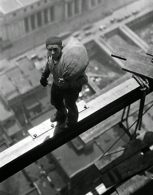 1. Ignoring the obvious danger of a worker falling from a narrow beam like this there must have been countless instances of pedestrians being hit by dropped objects when building work was carried out in this manner